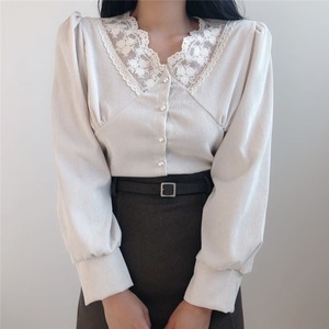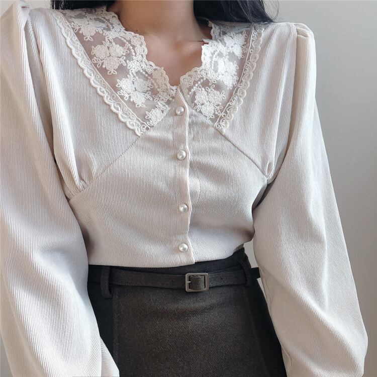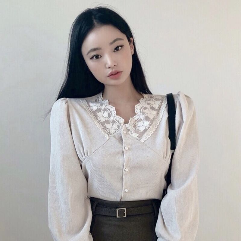 スプリングスタンダードVネックレース薄手クロップドトップス レディース レトロ 春物 ステッチ 韓国婦人26641037382