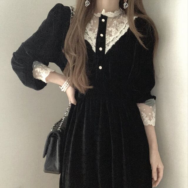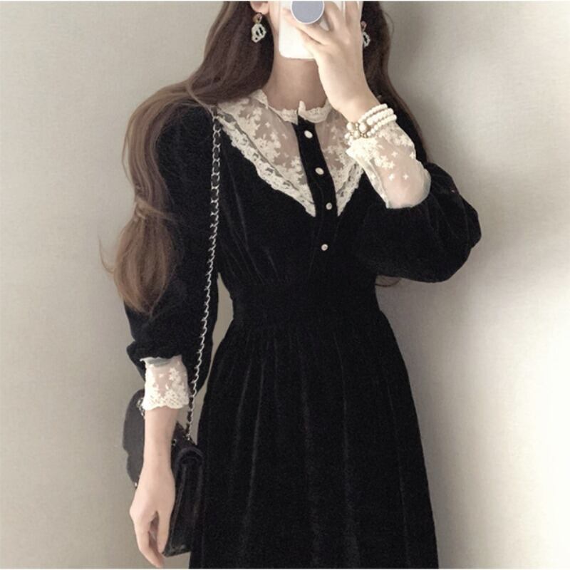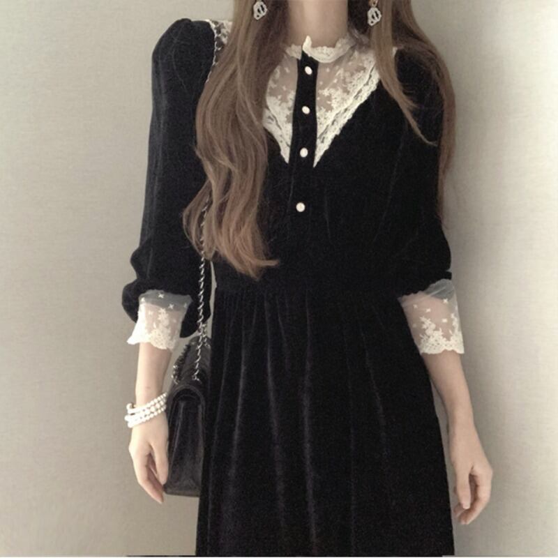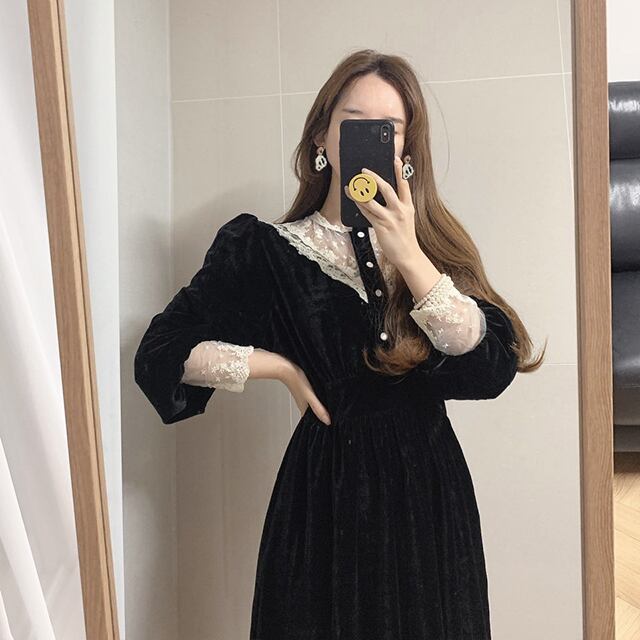 ブラックドレス スタイルラインロングスカート ゴールドベルベットオータムウィンター 秋物 冬物 韓国婦人18144761823