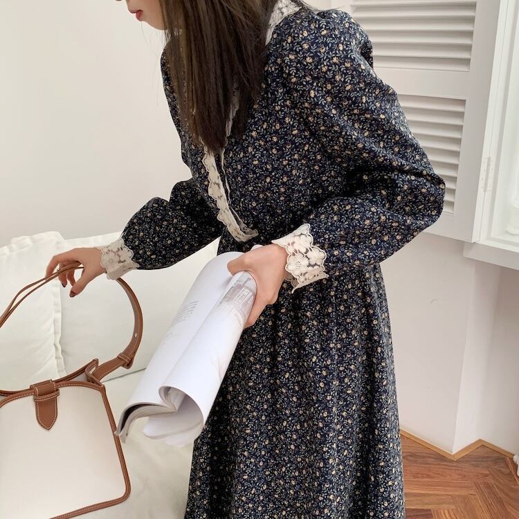 レースフローラルスカート スプリングスタンダードブラックドレス ロング レトロ 春物 花柄 ステッチ 韓国婦人35011239958