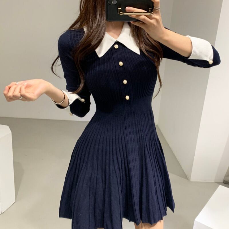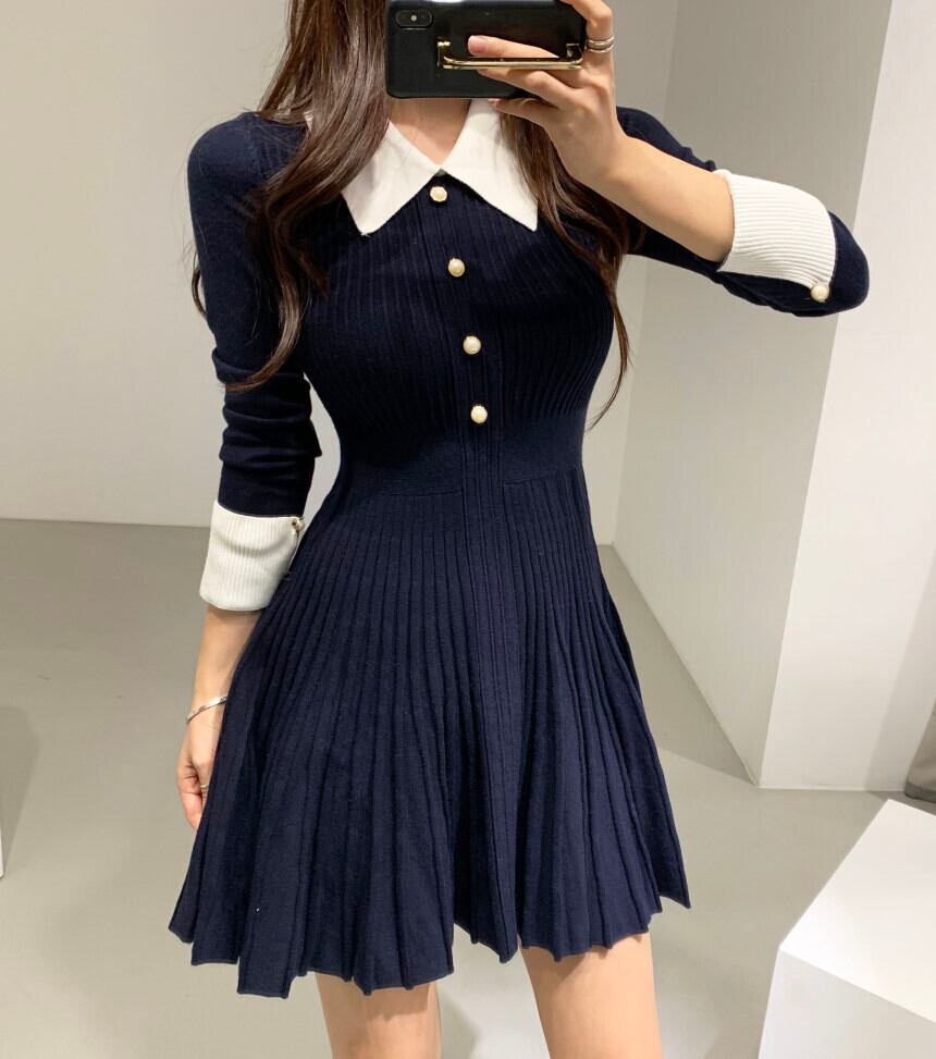 スプリングオータムカラーウェストショートセーター ニットスカート ドレス レディース 春物 秋物 ステッチ 韓国婦人8058609229