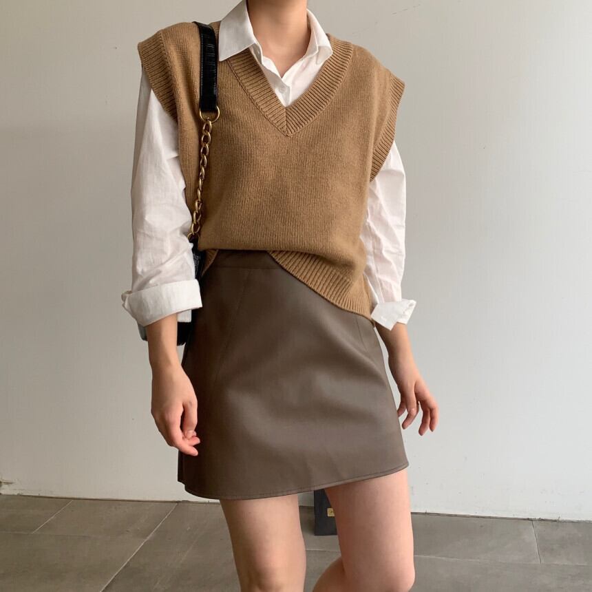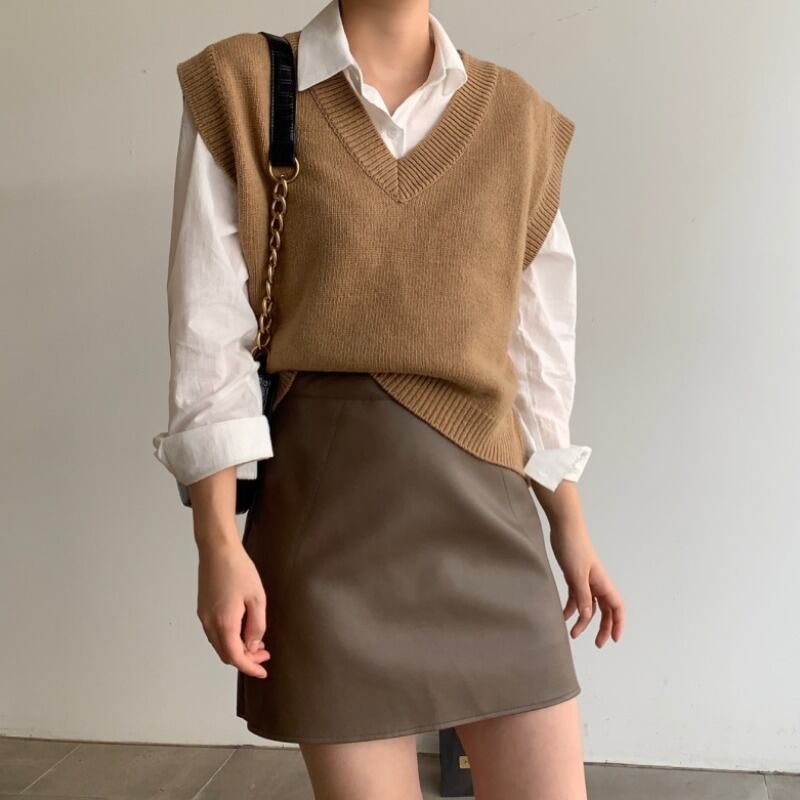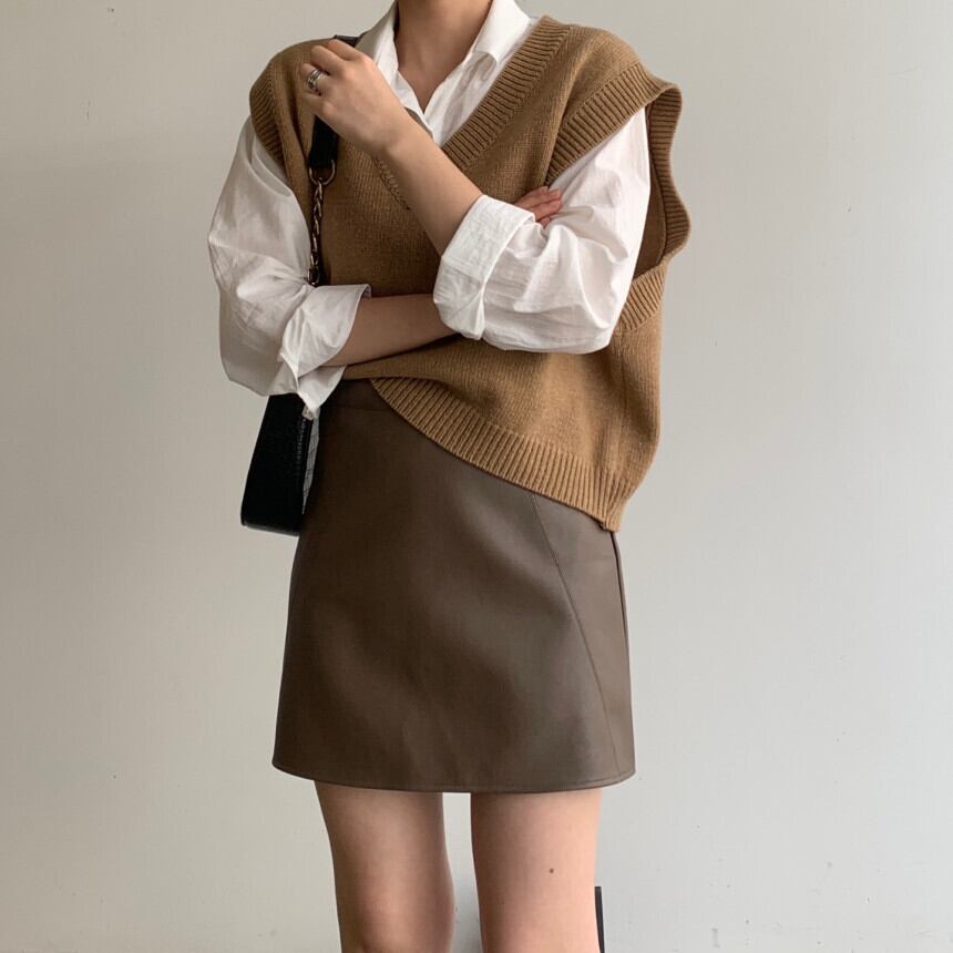 スタンダードVネックルーズシャツ ハイウェストスカート ロング レトロ 韓国婦人7914808618