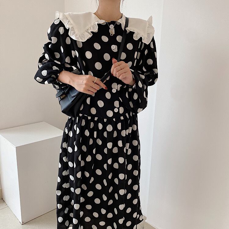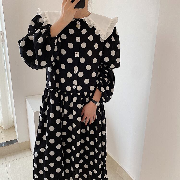 オータムスタンダードルーズハイウェストウェストプリーツスリーブ水玉ドレス レディース レトロ 秋物 韓国婦人48666271343