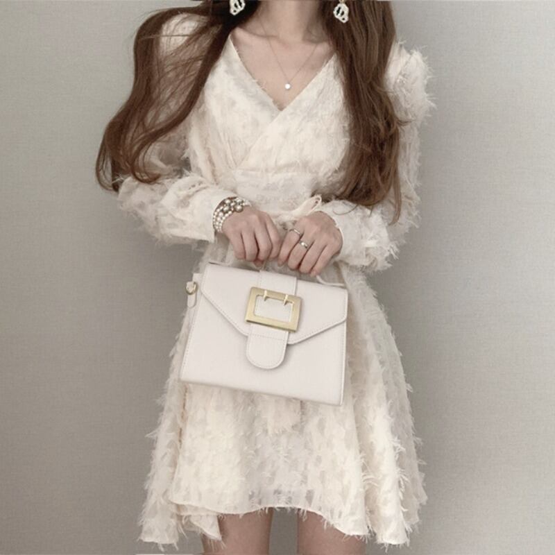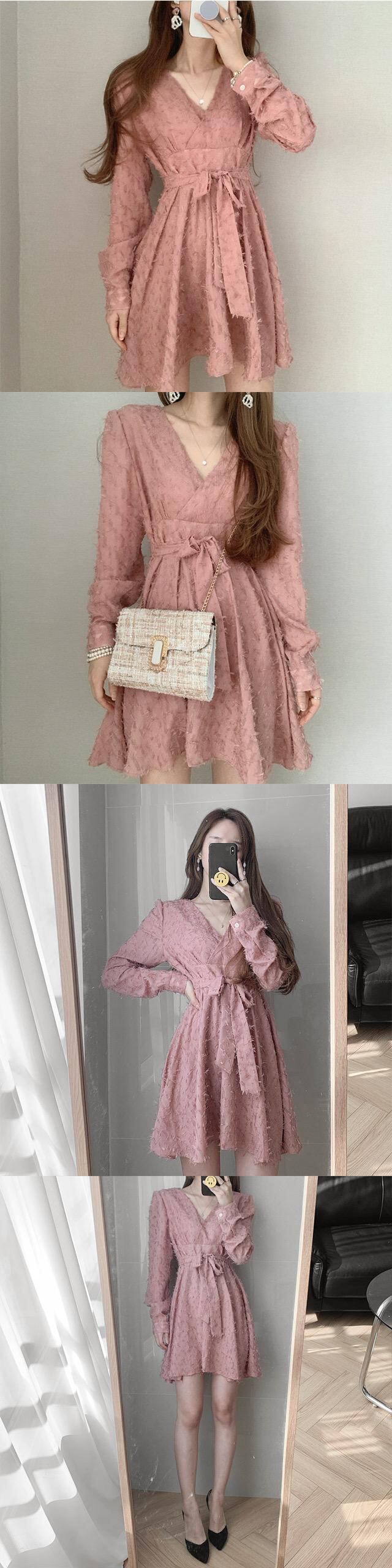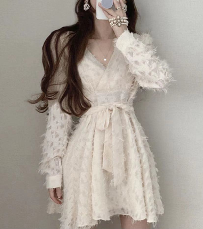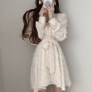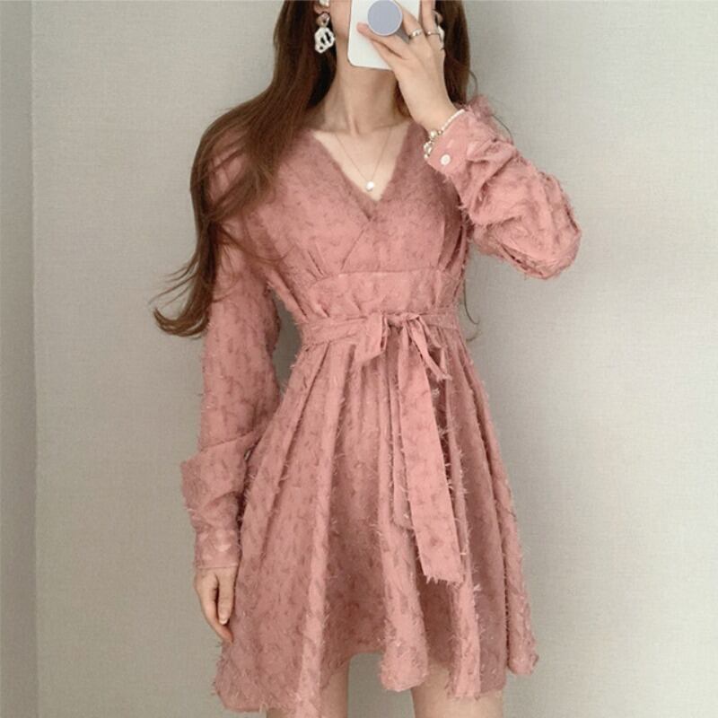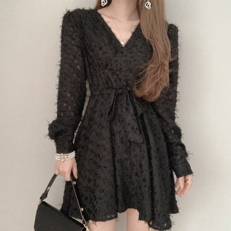 オータムウィンターVネッククロスウェストリボンドレス ショートスカート ロング レース 秋物 冬物 レースアップ 韓国婦人80691603192