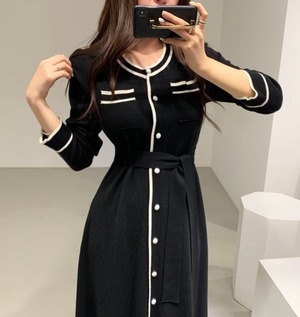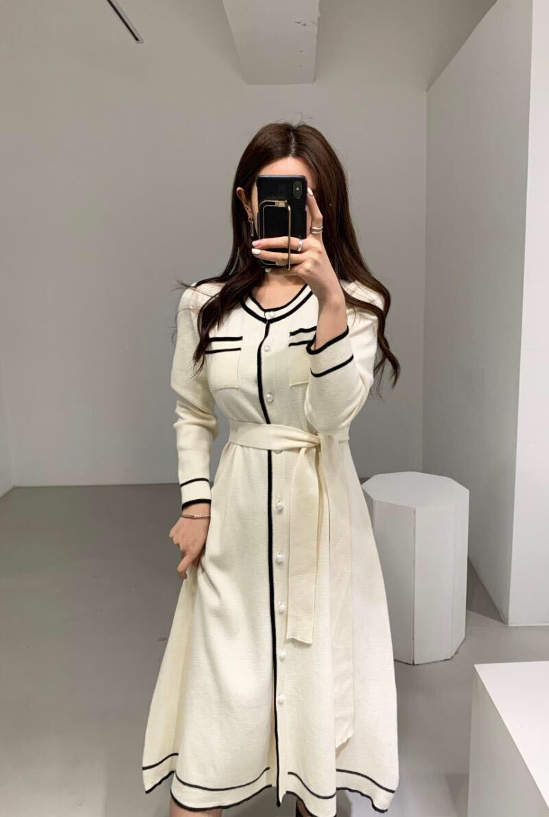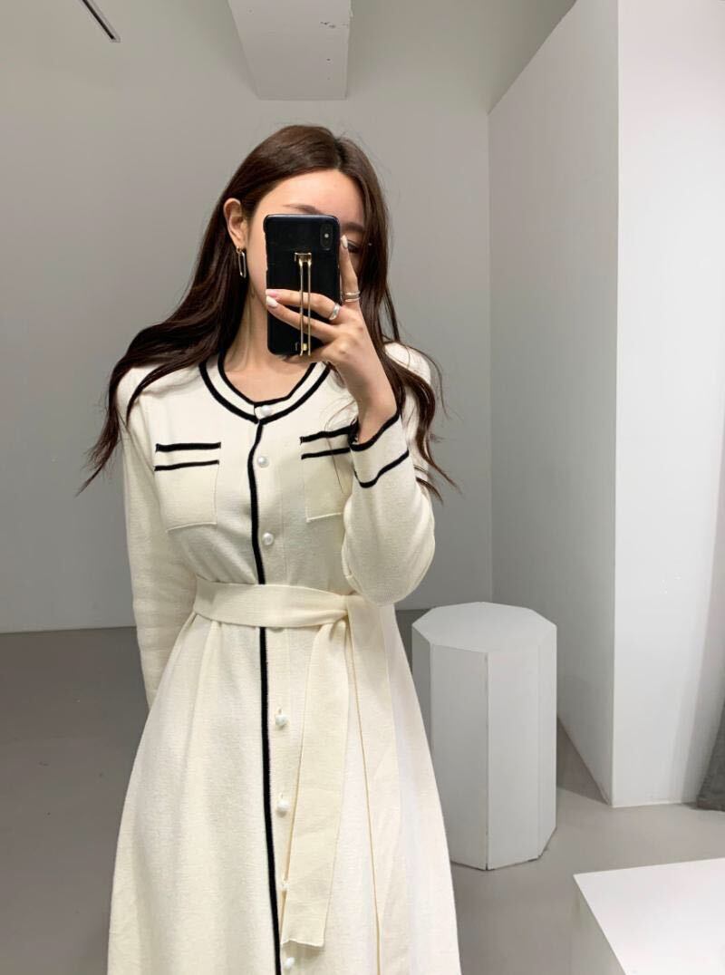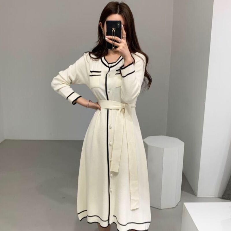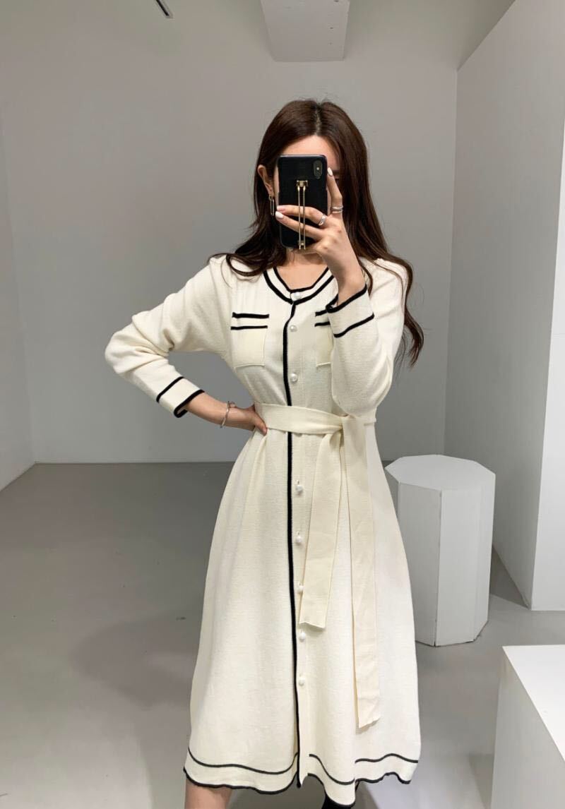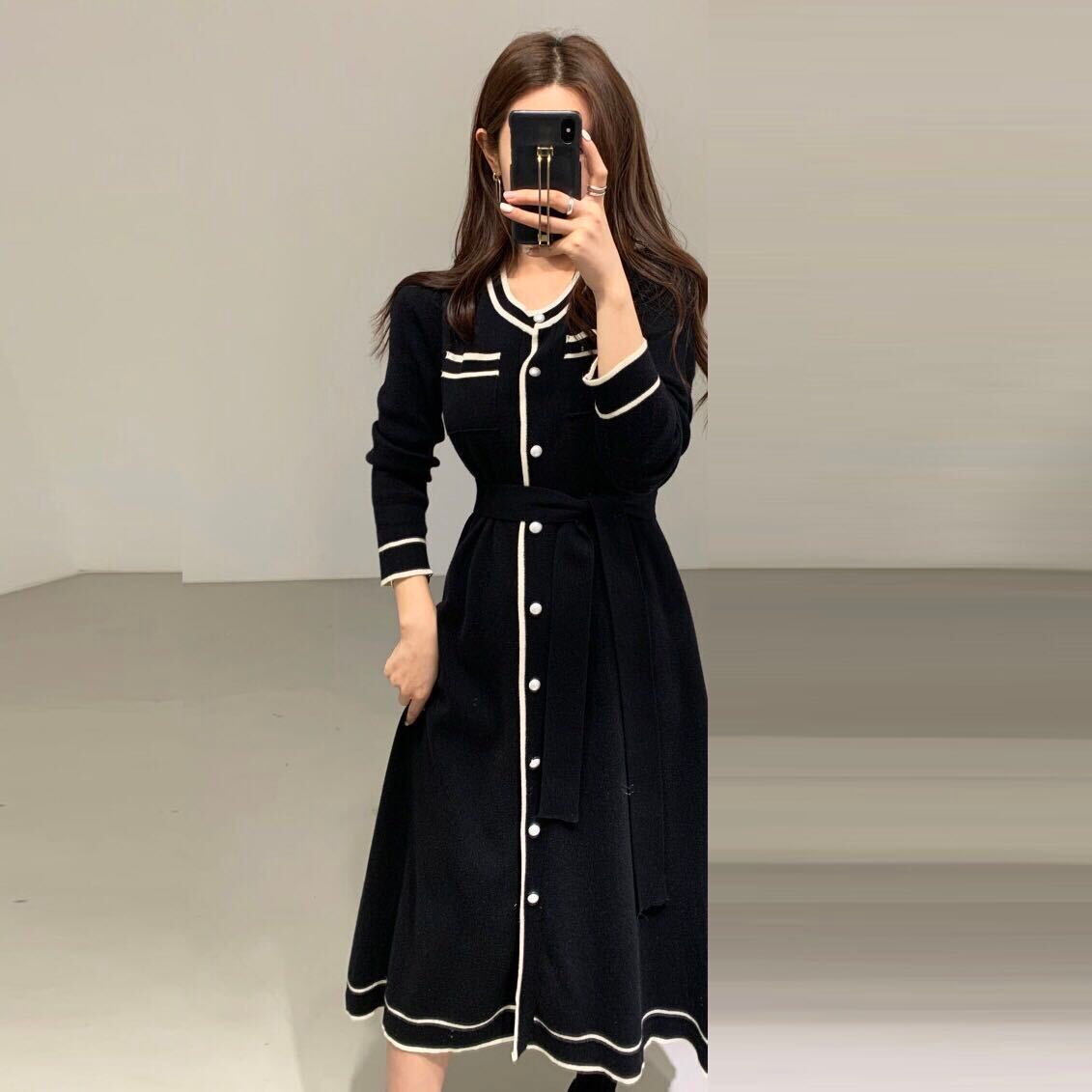 スタンダードカラーラインラウンドネックウェスト薄手ニットドレス レトロ Oネック 韓国婦人20593888013