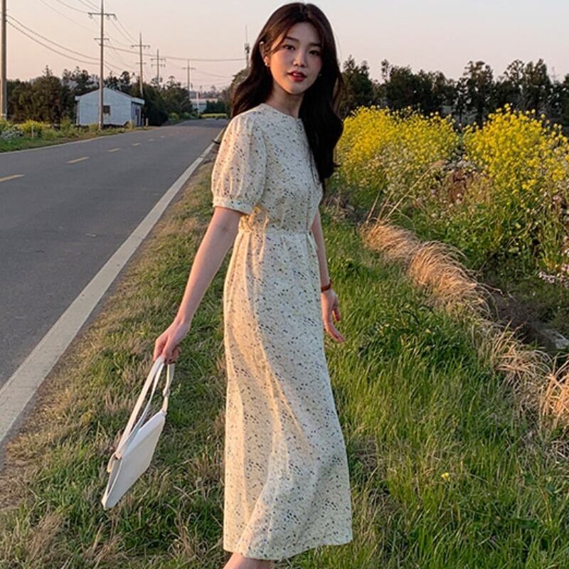 サマーフローラルラウンドネックウェストドレス スカート 夏物 花柄 Oネック 韓国婦人11557434698