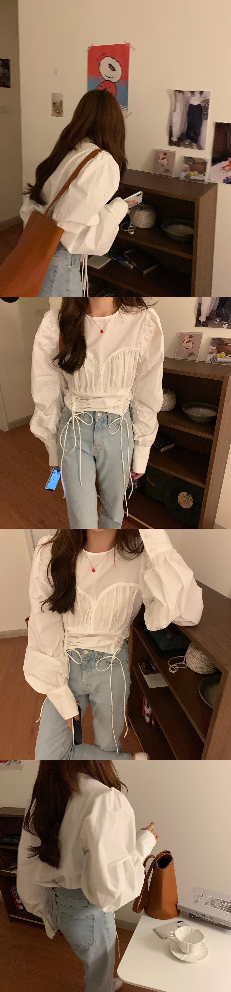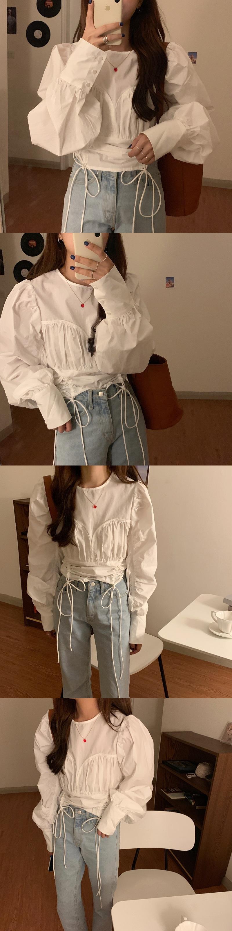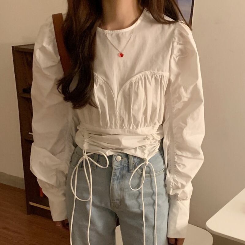 オータムスタイルスタンダードギャザーウェストブラウス 長袖スリーブシャツ レディース ロング レトロ 秋物 ステッチ 韓国婦人69905737455