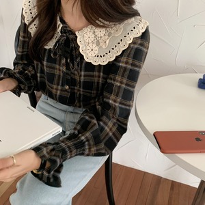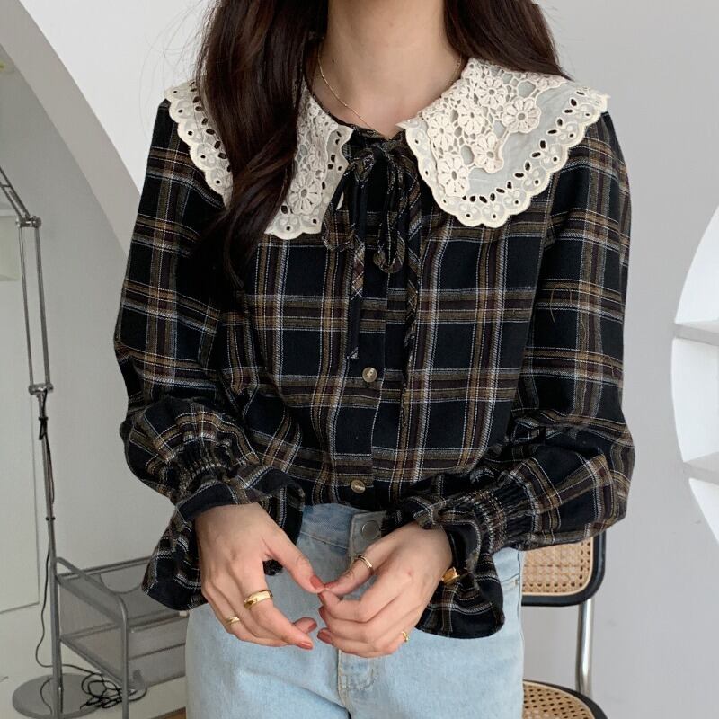 スプリングオータムレースカラートップス ルーズスタイル格子柄シャツ レディース 春物 秋物 ステッチ 韓国婦人57648588865