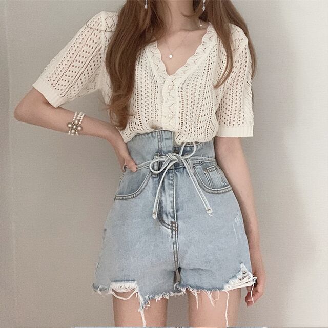 スタンダードVネックレース薄手パールバックルルーズカーディガンセーター レトロ 真珠 韓国婦人72696358529