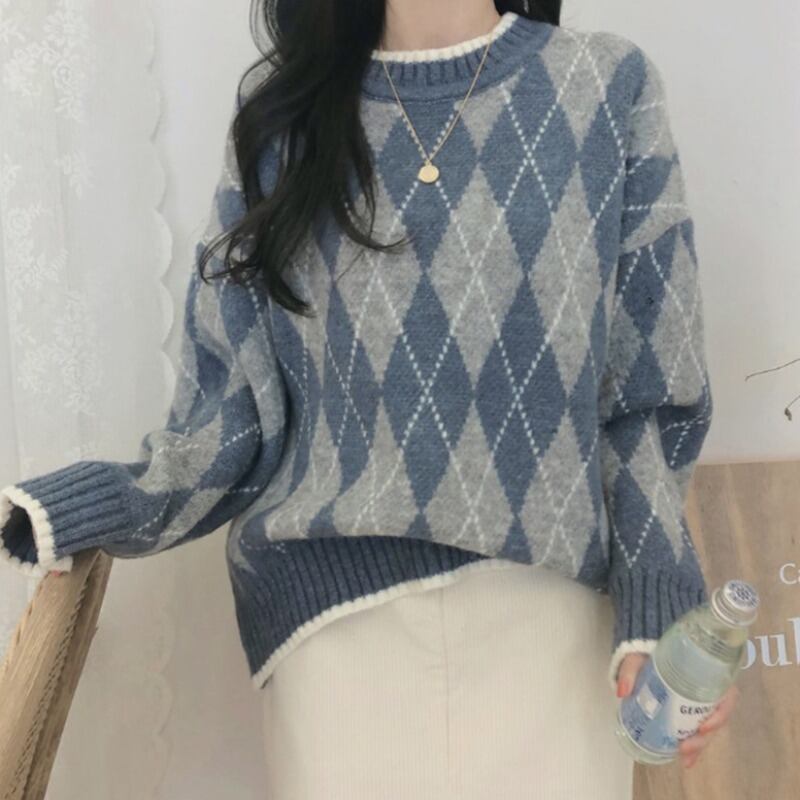 オータムウィンタースタンダードレッドルーズ格子柄セーター レディース レトロ 秋物 冬物 韓国婦人58691700220