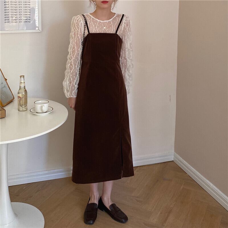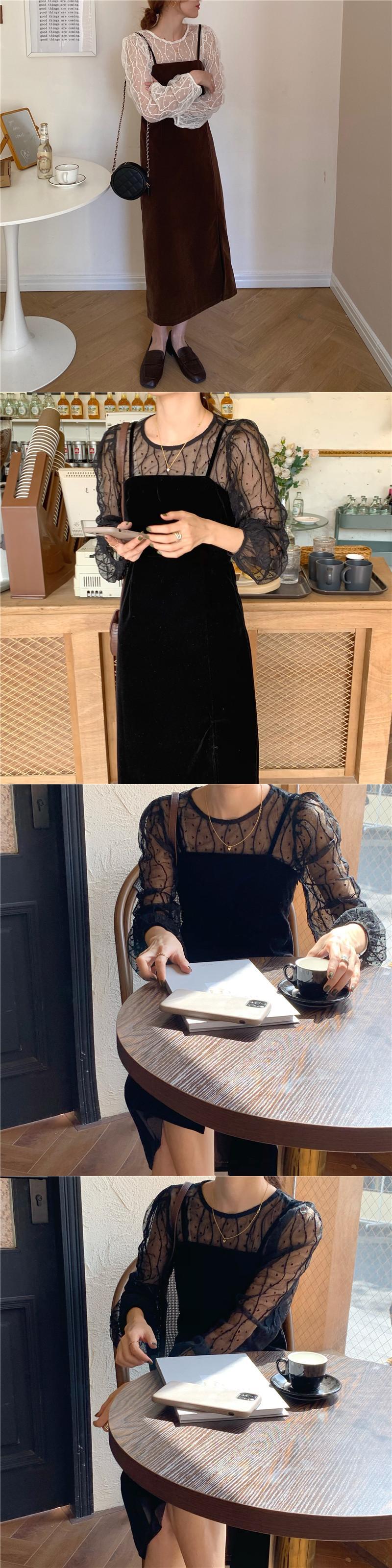 スプリングレースシャツ ゴールドベルベットスカート ドレス ロング 春物 韓国婦人62251674997