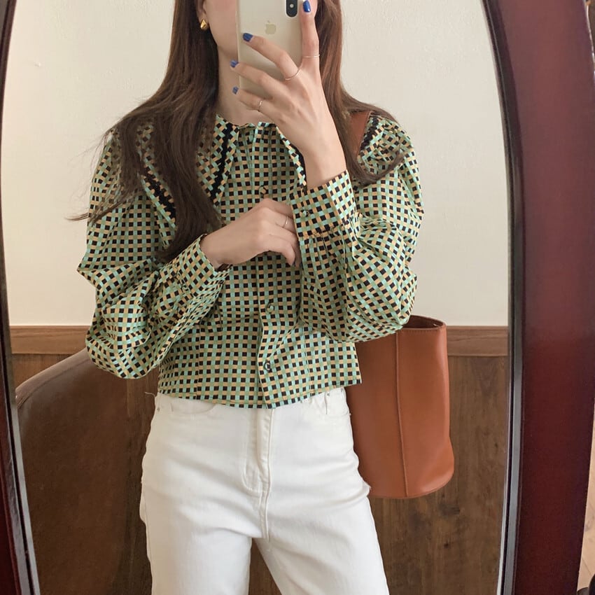 シャツ オータムカラー格子柄 ロング 秋物 韓国婦人58619611155