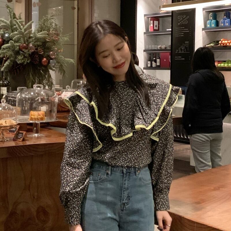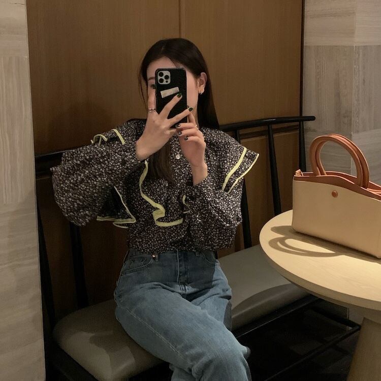 スタンダードスタイルラウンドネックフリルカラールーズフローラルシャツ ブラウス レディース ランタンスリーブ レトロ ラッフル 花柄 Oネック 韓国婦人14087745095