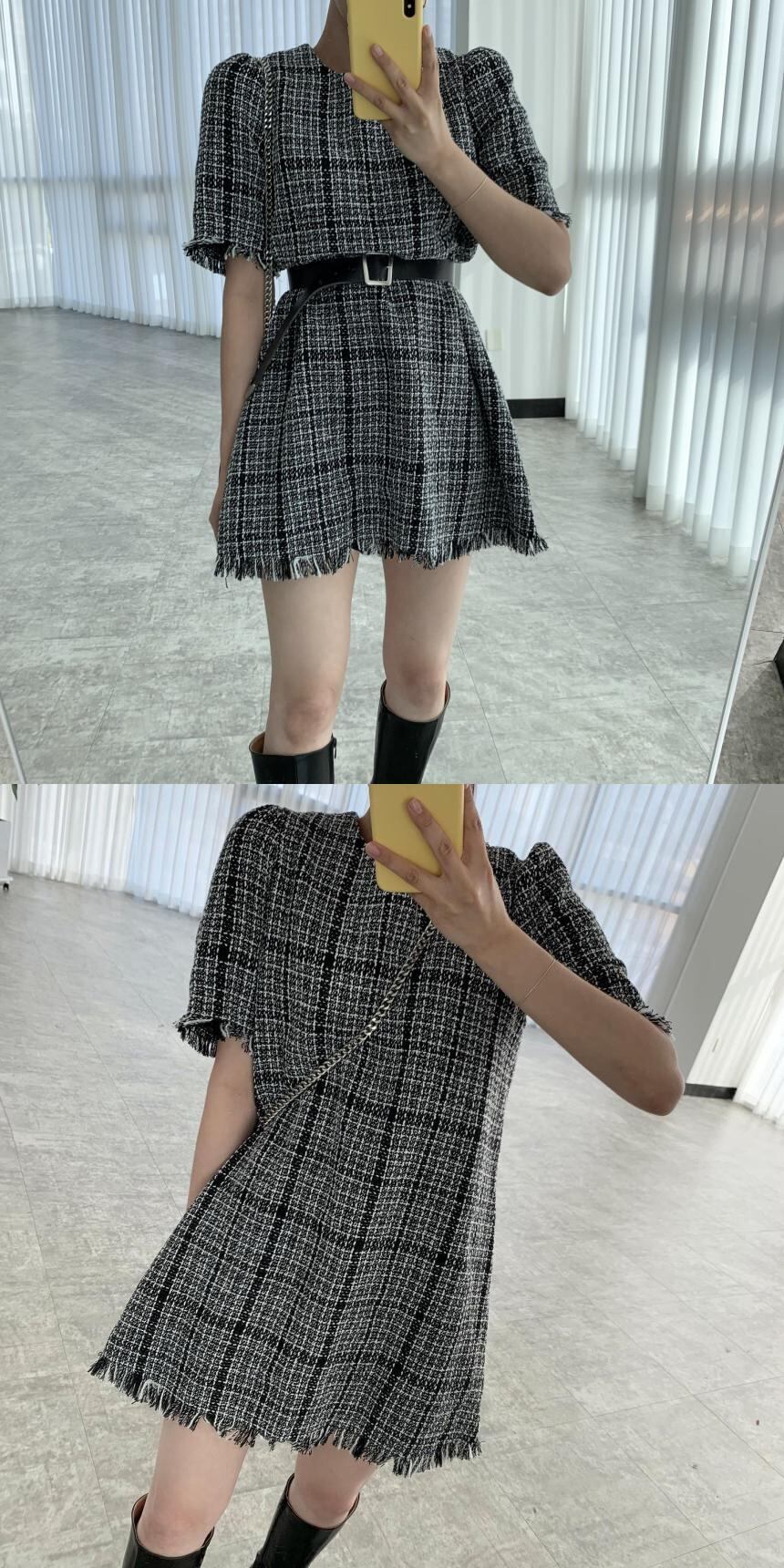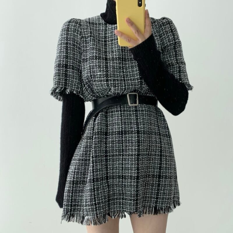 スプリングツィードドレス 格子柄ウェストスカート スタイルレディース 春物 韓国婦人6138998636