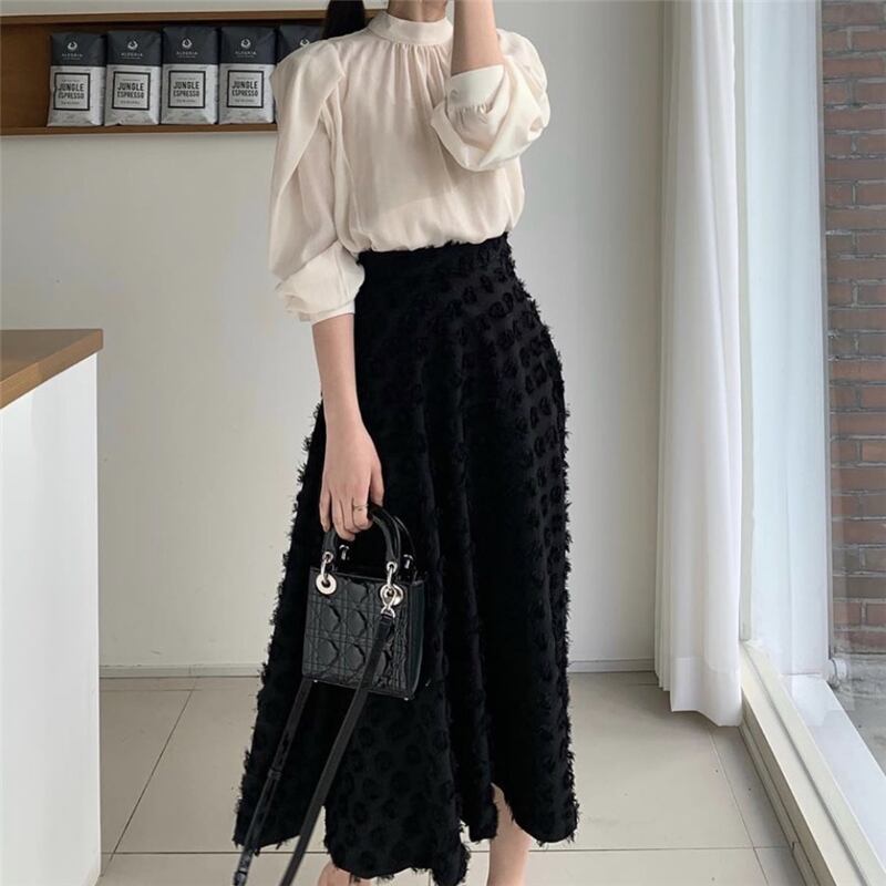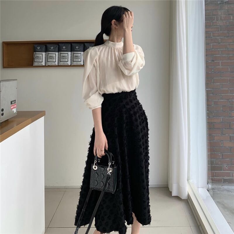 カラープリーツルーズスリーブシャツ ハイウェストウェストスカート ロング エレガント 韓国婦人11886949462