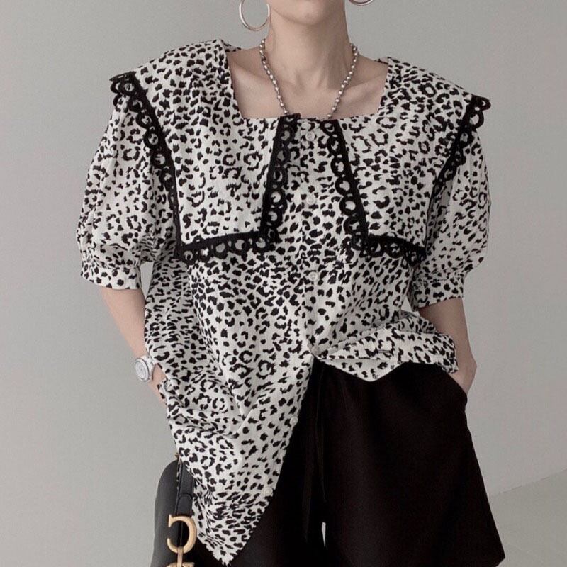 レースレオパードプリント柄シフォンシャツ サマースタンダードスリーブトップス レトロ 夏物 韓国婦人60935811687