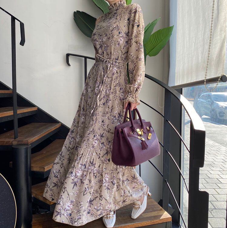 オータムラウンドネック薄手フローラルロングスカート シフォンドレス 大人ガーリー スウィート キュート カジュアル 秋物 花柄 Oネック 韓国婦人46451779401