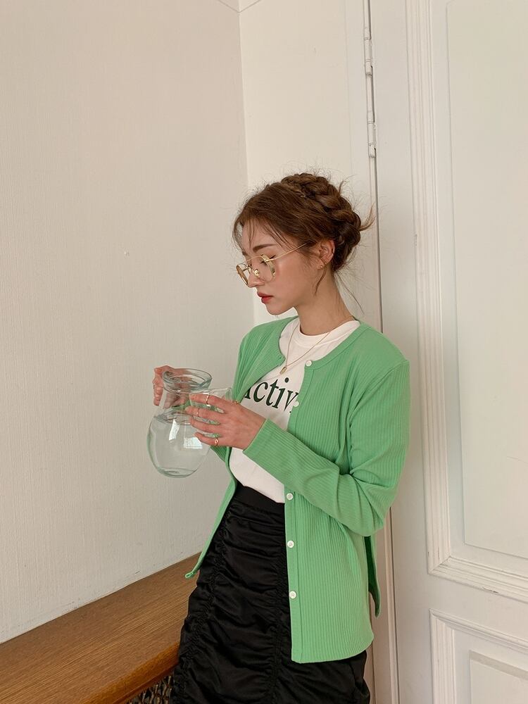オータム薄手グリーンTシャツ ボタントップス カーディガンジャケット ロング ピンク 秋物 韓国婦人71544817758