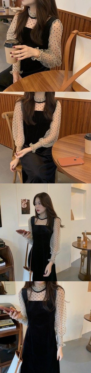 オータムウィンター水玉メッシュベルベットスリーブツーピース薄手ブラックドレス 秋物 冬物 ステッチ 韓国婦人95885855896