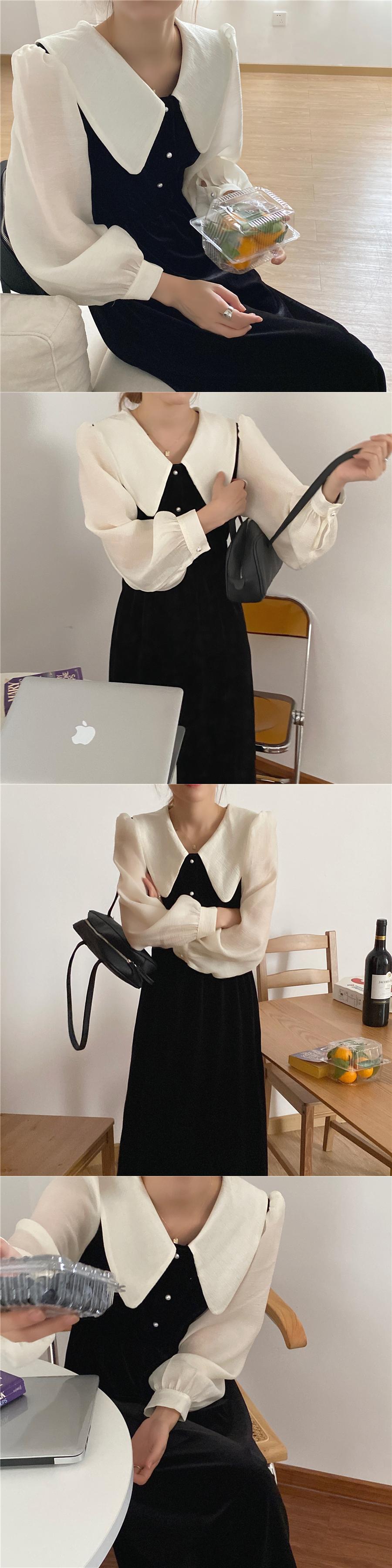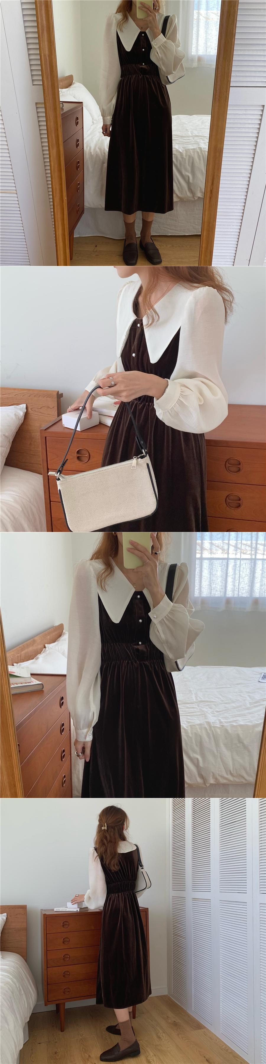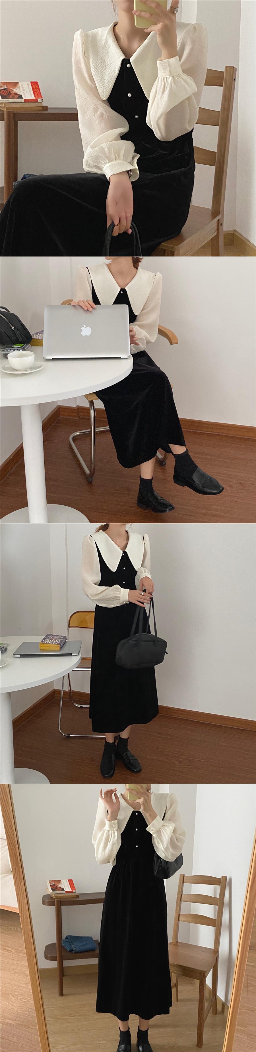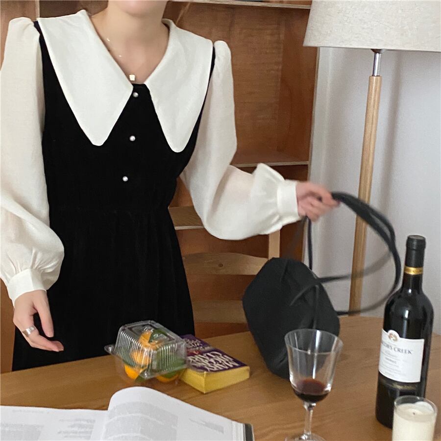 ゴールドベルベットドレス オータムウィンタースタイルスタンダードカラーウェストプリーツブラック レトロ 秋物 冬物 韓国婦人34529858947
