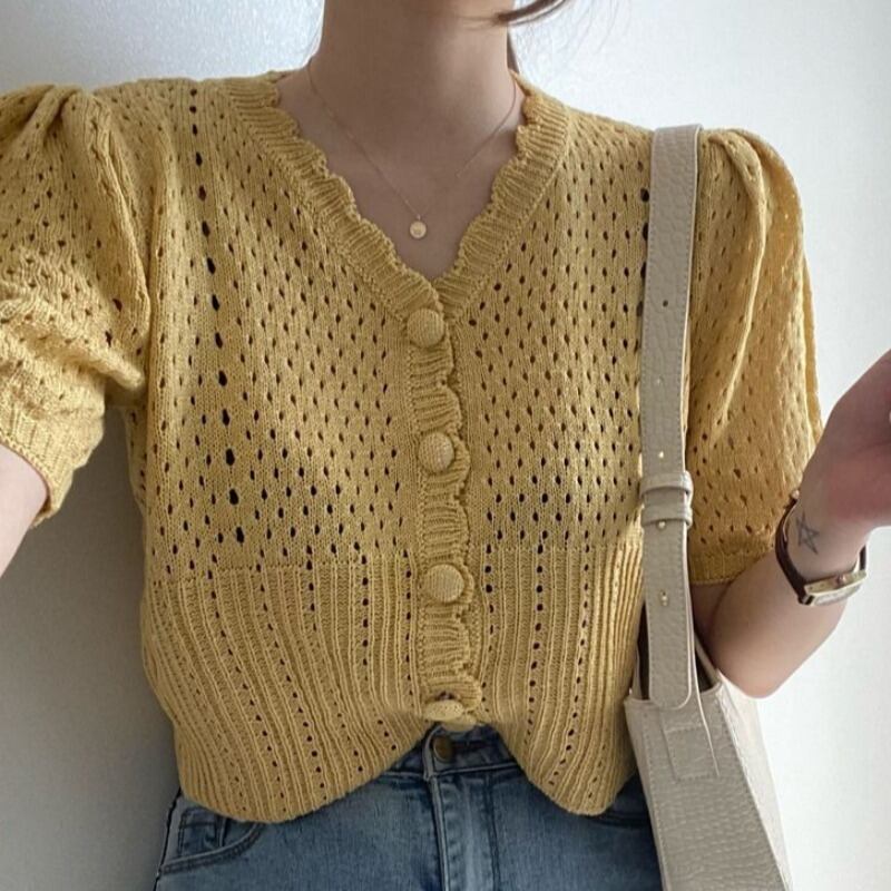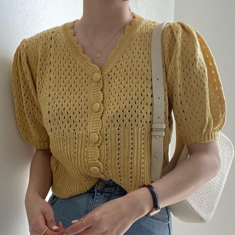 Vネックスリーブニットセーター 薄手サマークロップドトップス 夏物 韓国婦人77232056304