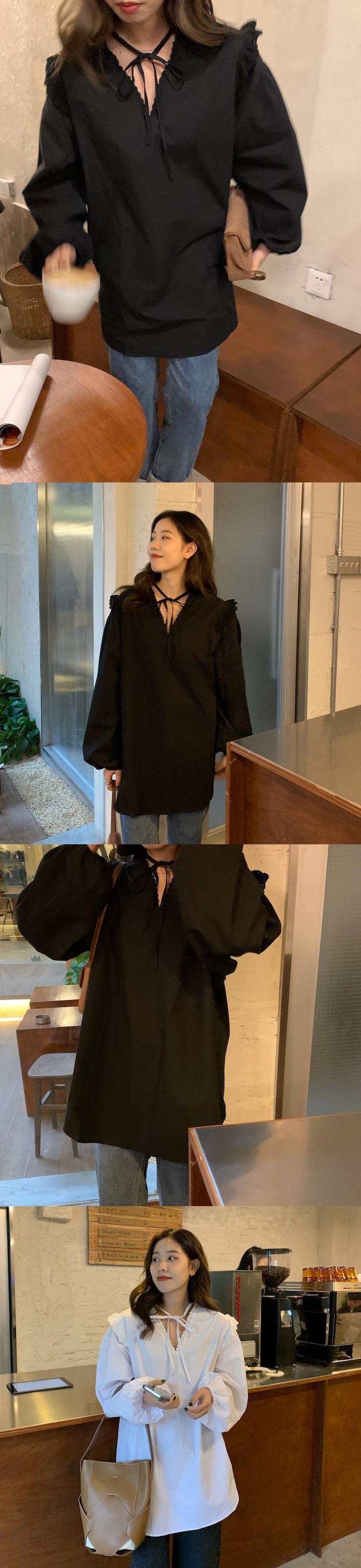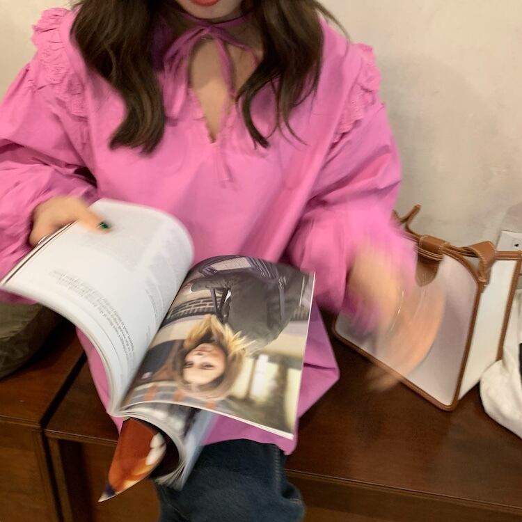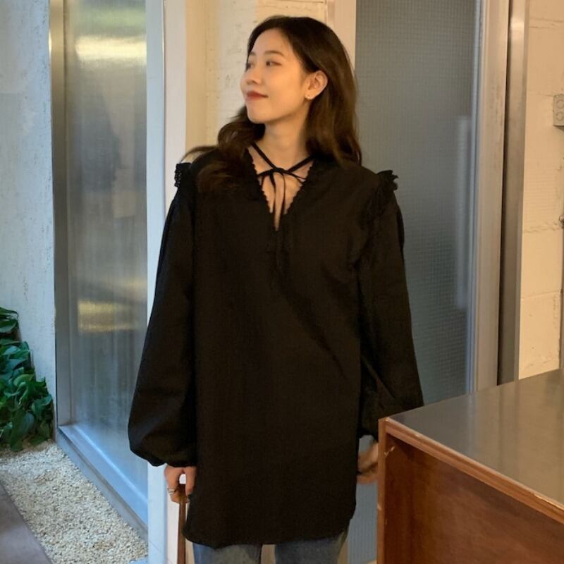 ブラウス ルーズVネックレーススリーブトップス ステッチ 韓国婦人77822775495