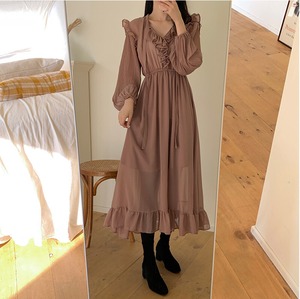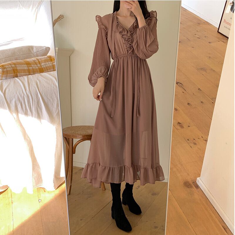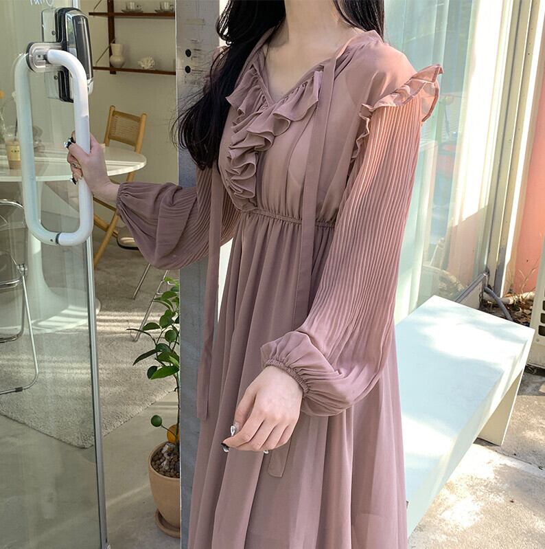 オータムスタンダードプリーツウェストスリムドレス レディース ロング ランタンスリーブ レトロ 秋物 韓国婦人29582918271