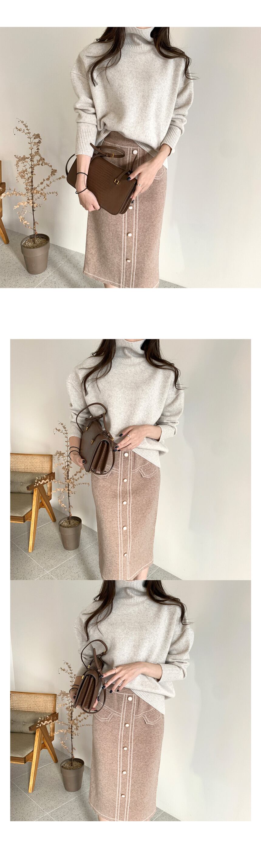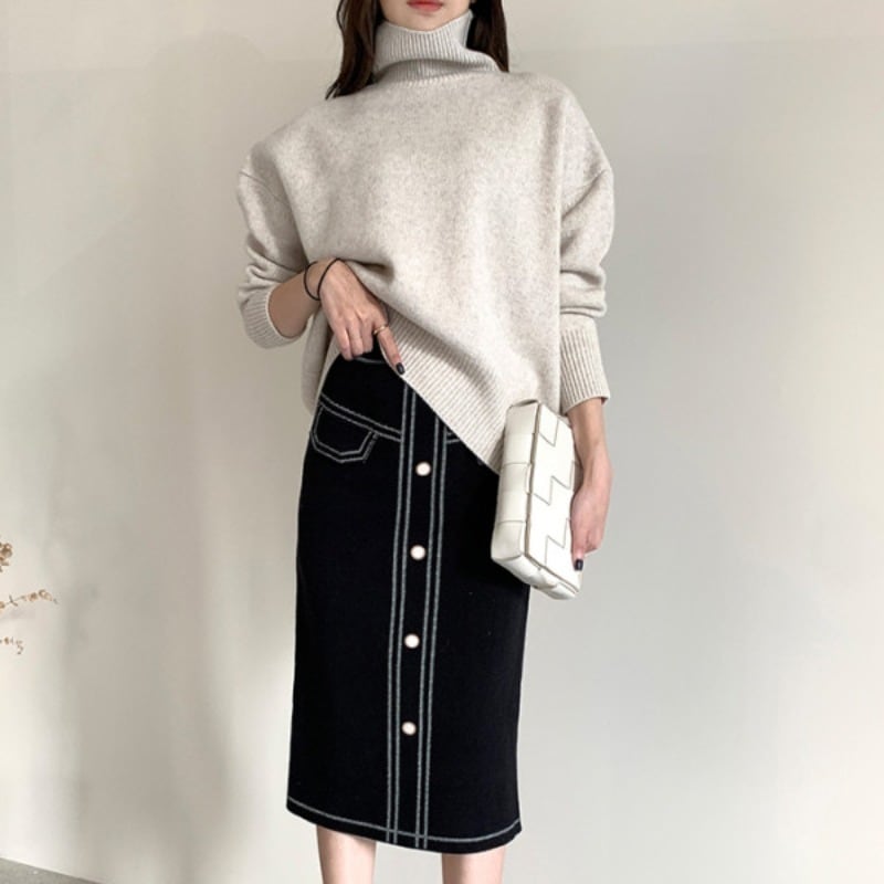 色:タートルネックセーター,黒スカート,コーヒー色のスカート