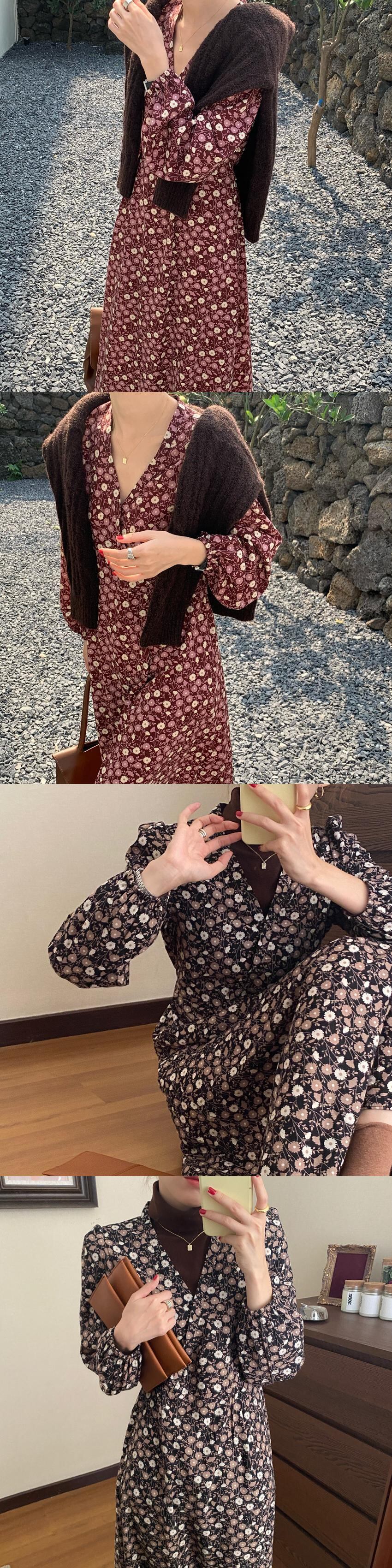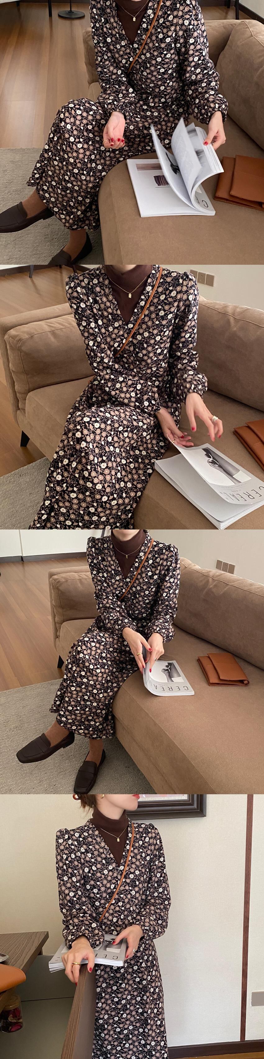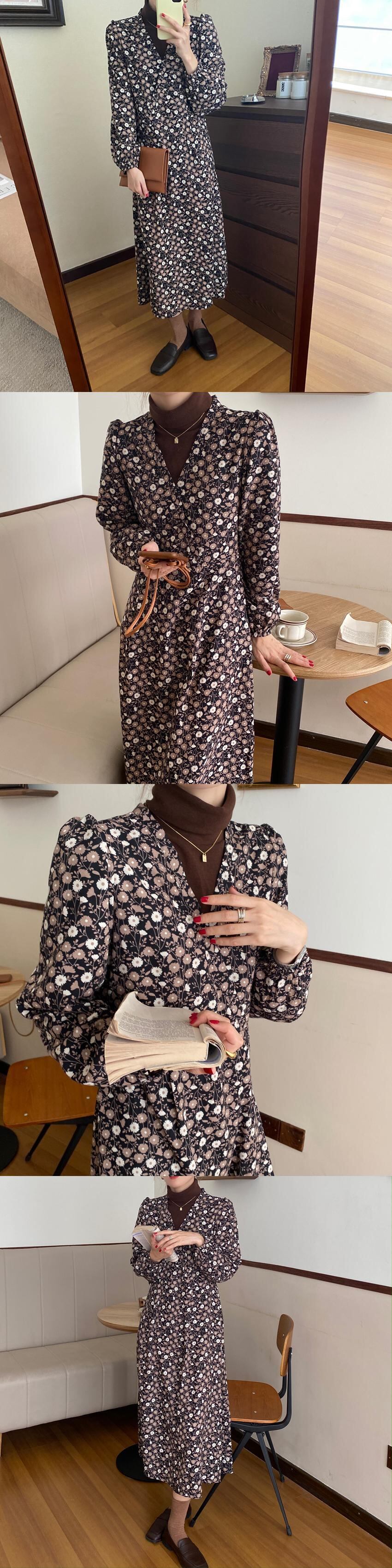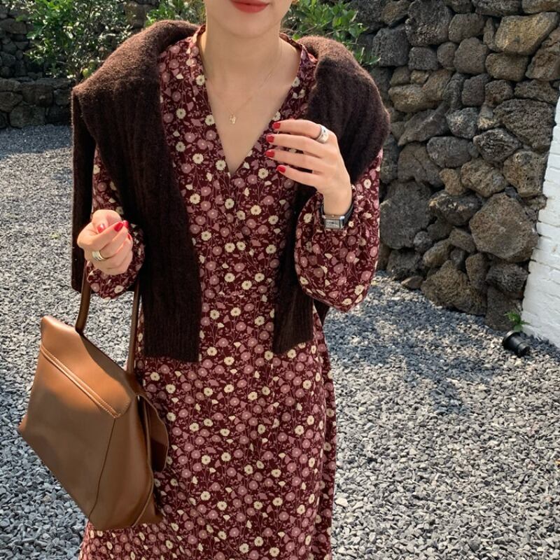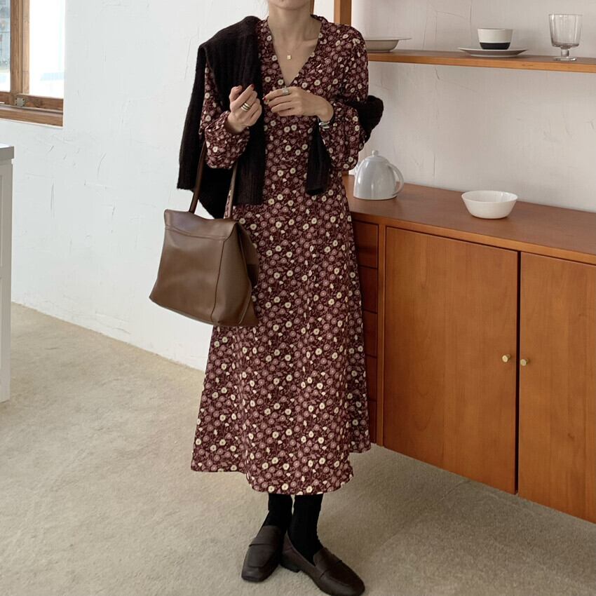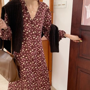 フローラルバンドウェストVネックスリムドレス ロング 花柄 韓国婦人31824874235