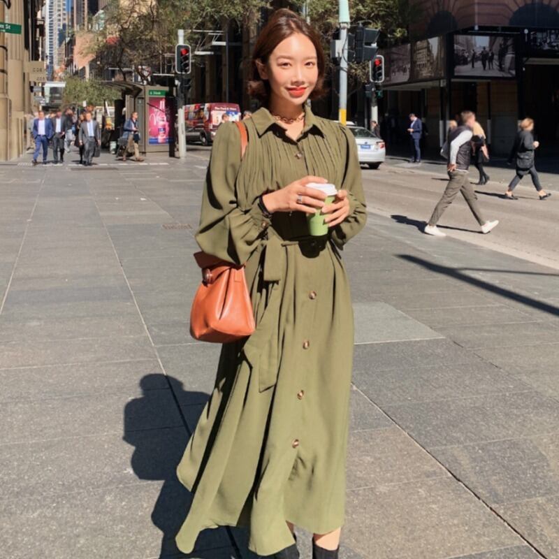 スプリングシフォンドレス ロングプリーツルーズ薄手スタンダード長袖スリーブシャツ レトロ 春物 韓国婦人57049379808