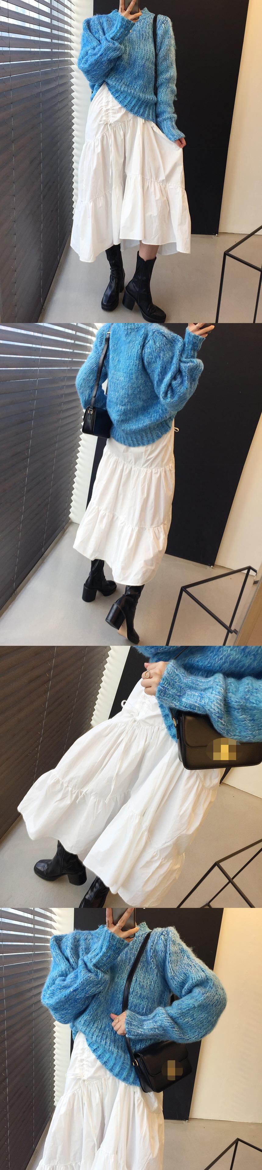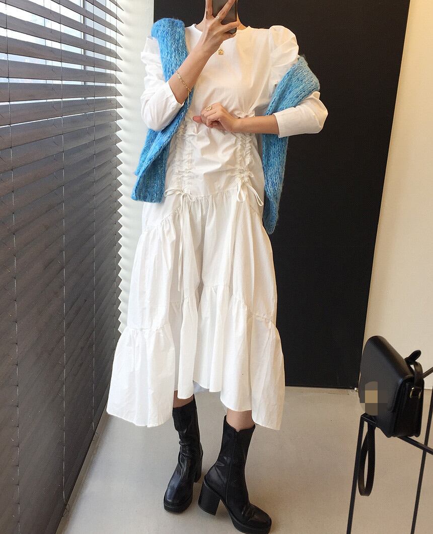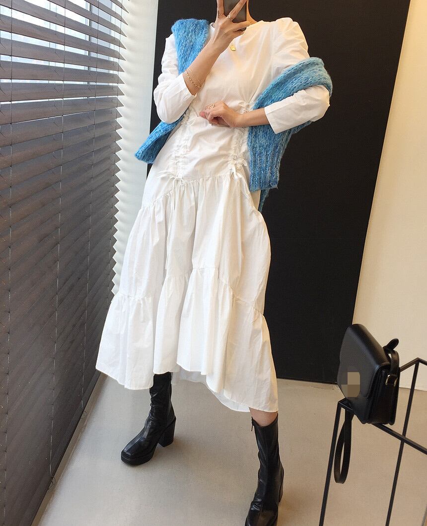 オータムギャザードレス カラーニットセーター ラウンドネック 秋物 Oネック 韓国婦人93852132581