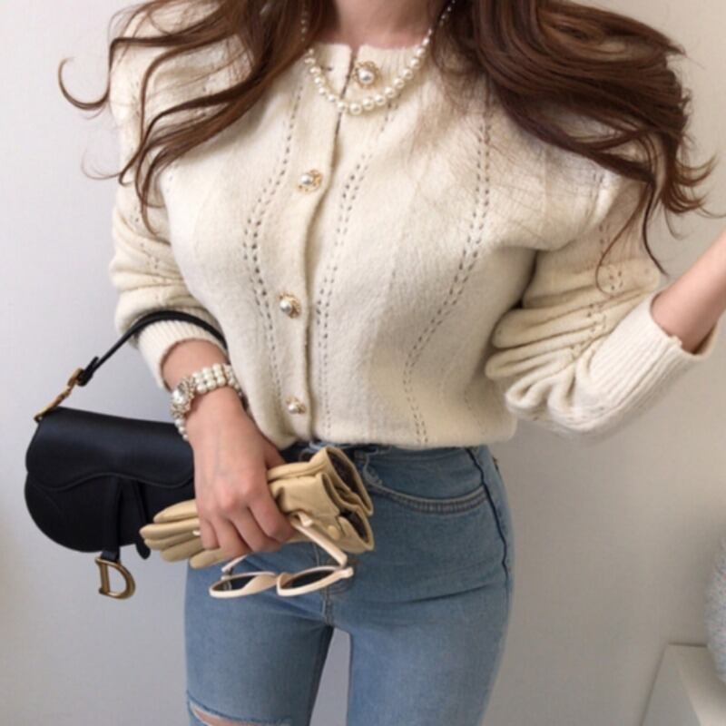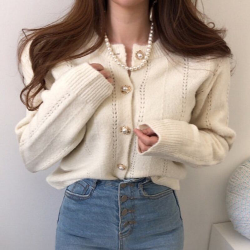 スプリングオータムスタンダードショートスリムスリーブパールボタンニットセーター ジャケット ランタンスリーブ レトロ 春物 秋物 真珠 韓国婦人12034873410