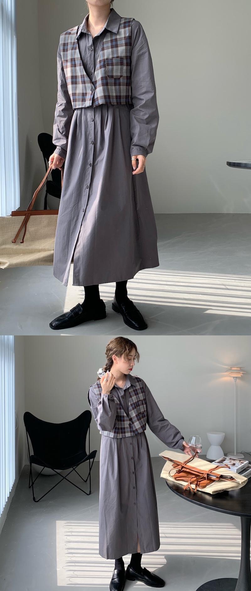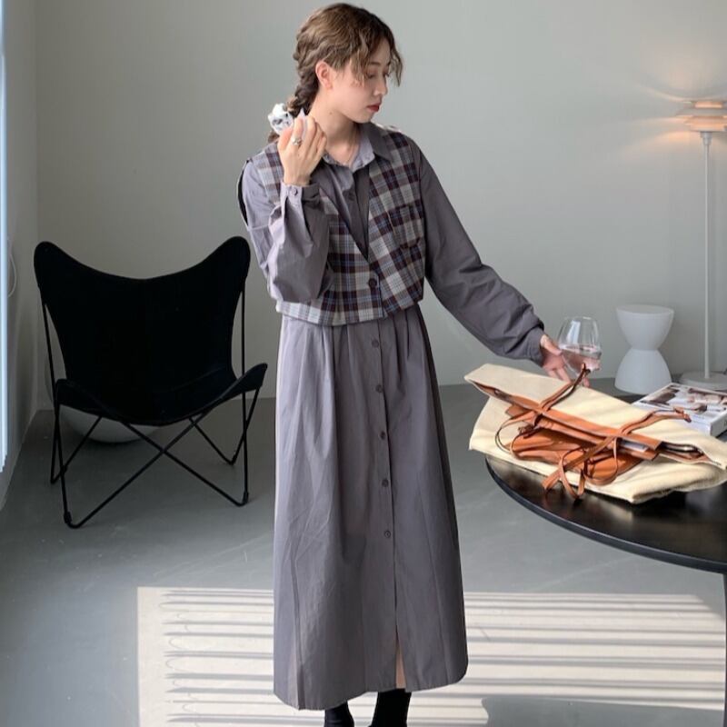 スプリングスタンダード格子柄シャツ ロングドレス ルーズ薄手レディース レトロ 春物 韓国婦人23620236357
