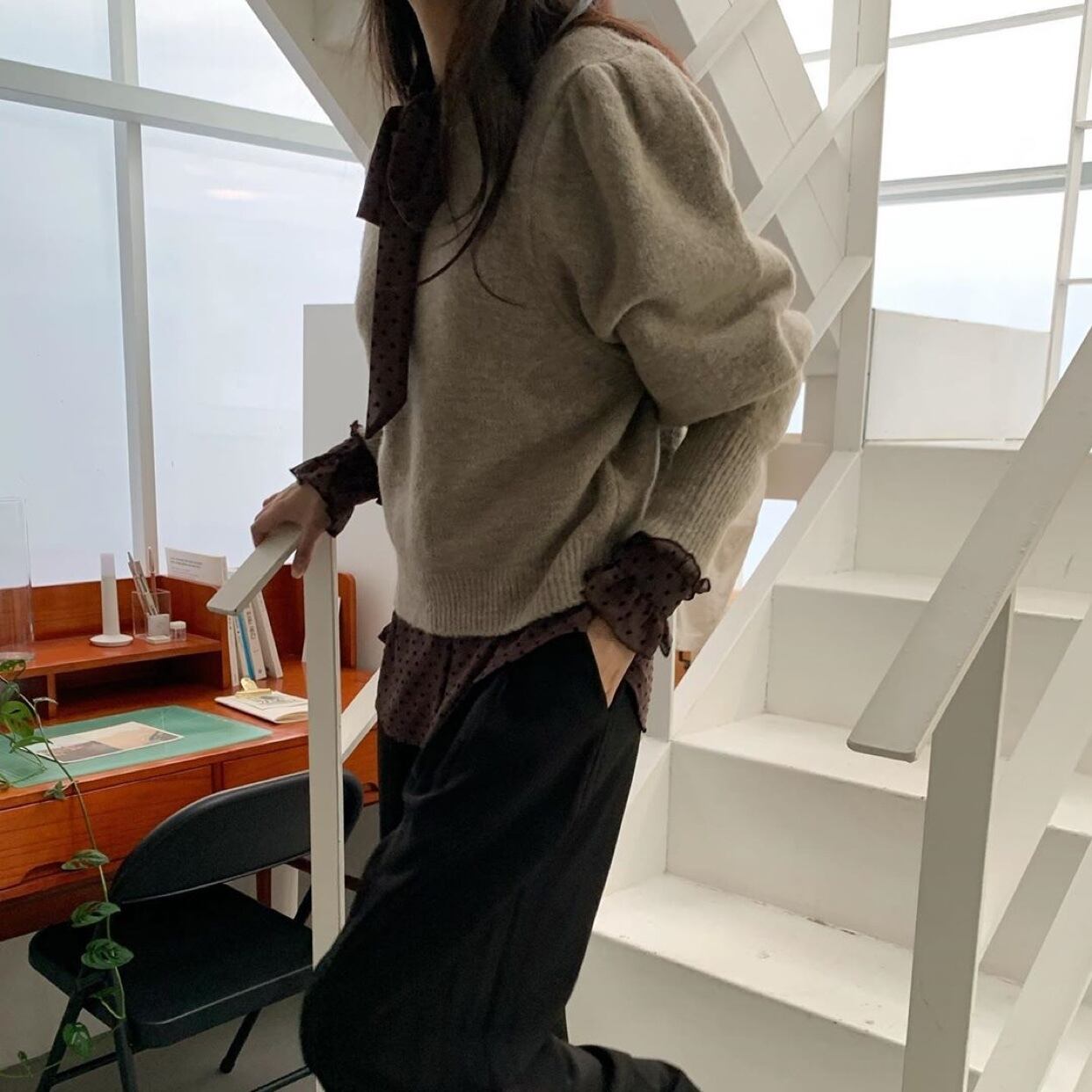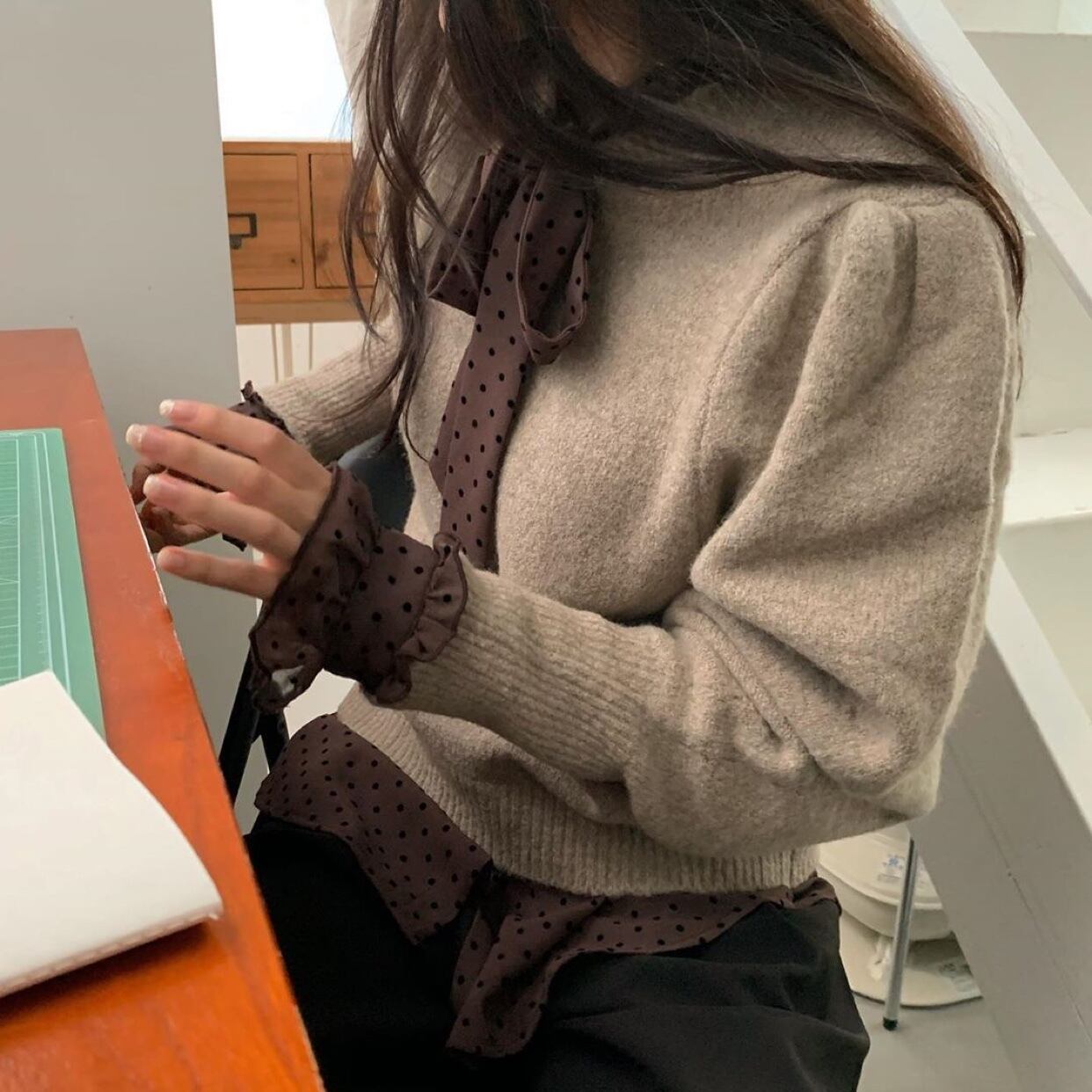 リボン水玉シャツ スリーブプルオーバー ソリッド カラーセーター エレガント ソリッドカラー 韓国婦人14910930835