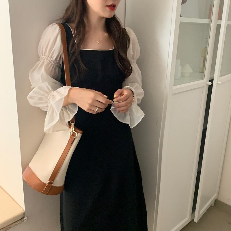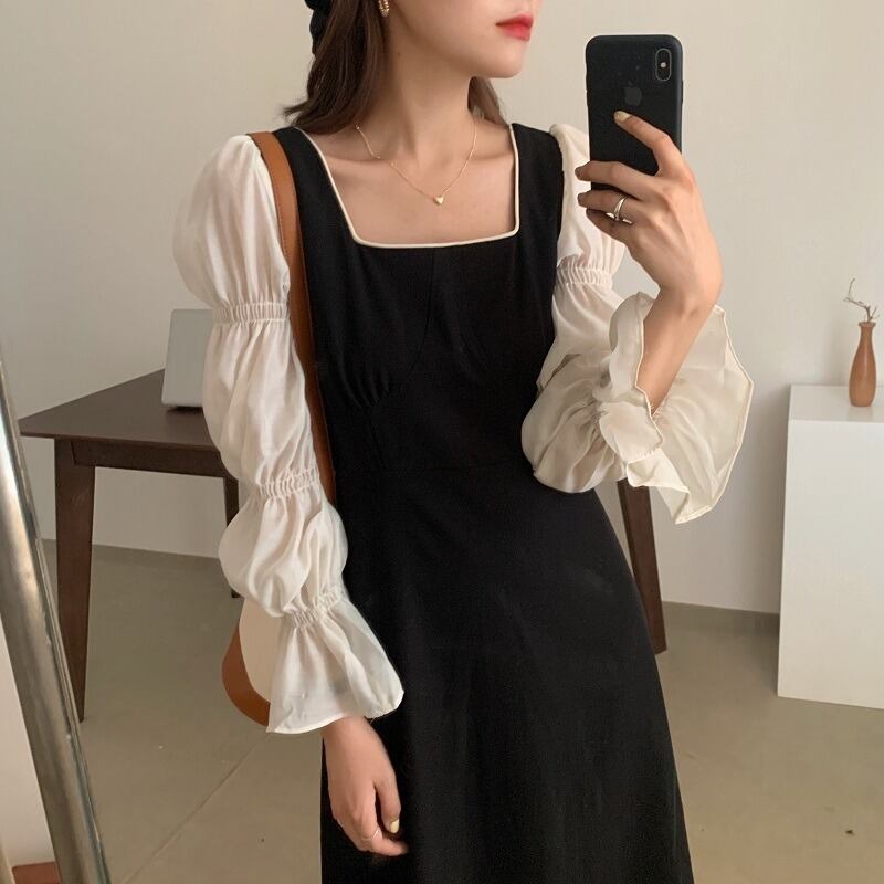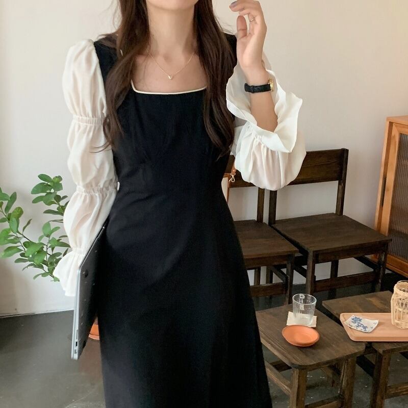 スプリングスタイルブラックドレス ウェスト薄手 ロング レッド 春物 スクウェア 韓国婦人98568229750