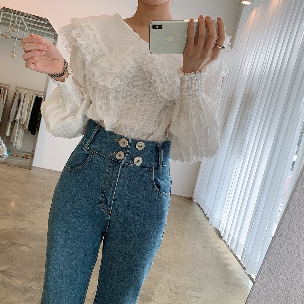 ホワイトシャツ オータムスタイルカラーレースブラウス ロング 秋物 韓国婦人21889849493