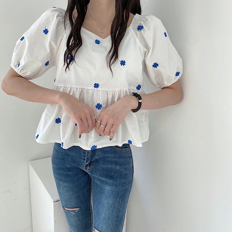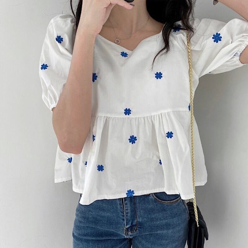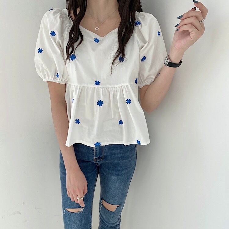スリーブVネックルーズシャツ レディースサマースタイルFlowerデザイン ブラウス レッド 刺繍 夏物 フラワーデザイン 韓国婦人87563146893