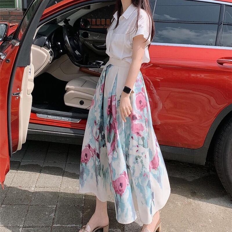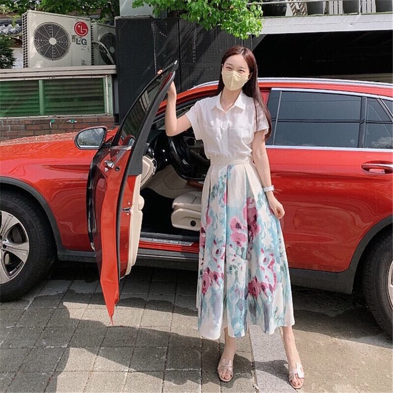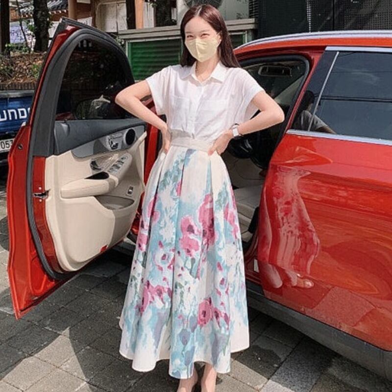 シャツ スタンダードプリント柄スカート サマー レトロ 夏物 韓国婦人34303385383
