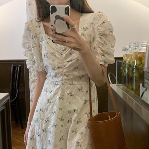 Vネックプリーツスリーブフローラルウェストドレス サマーAラインスカート 夏物 花柄 韓国婦人27749256990