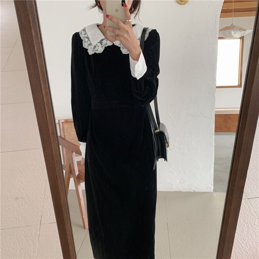 ベルベットオータムカラーレース薄手ドレス 秋物 ステッチ 韓国婦人56447015178