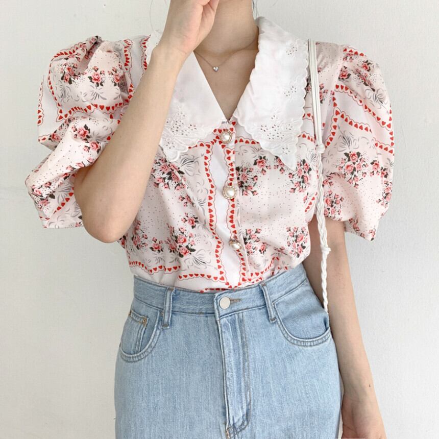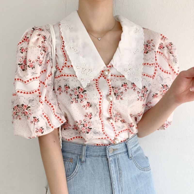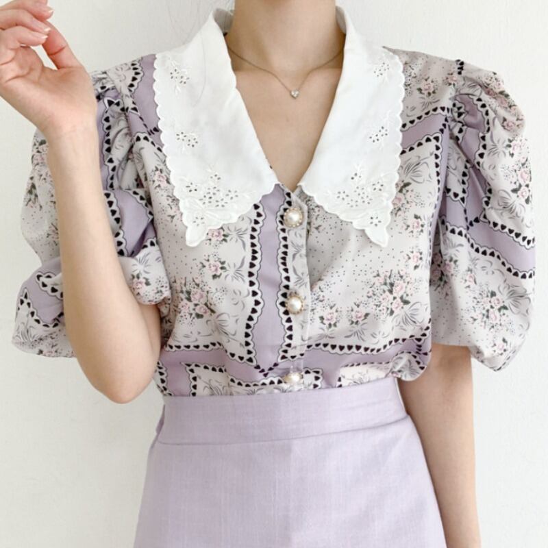スタンダード刺繍カラーフローラルシフォンシャツ スリーブブラウス サマー レトロ 夏物 花柄 韓国婦人56188777676