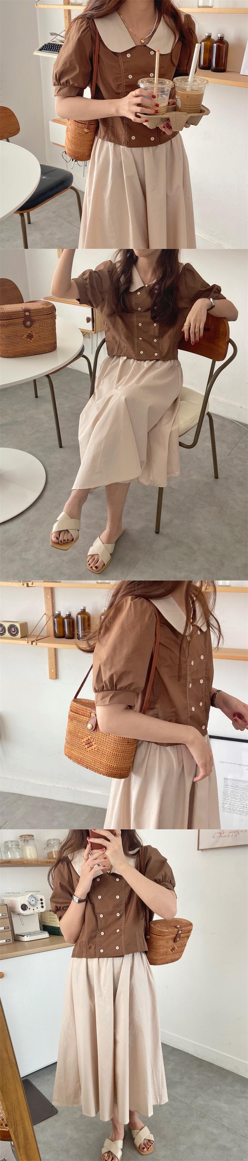 色:アプリコットトップ,ホワイトトップ,ブラウントップ,コーヒー色のスカート,青いスカート,アプリコットスカート