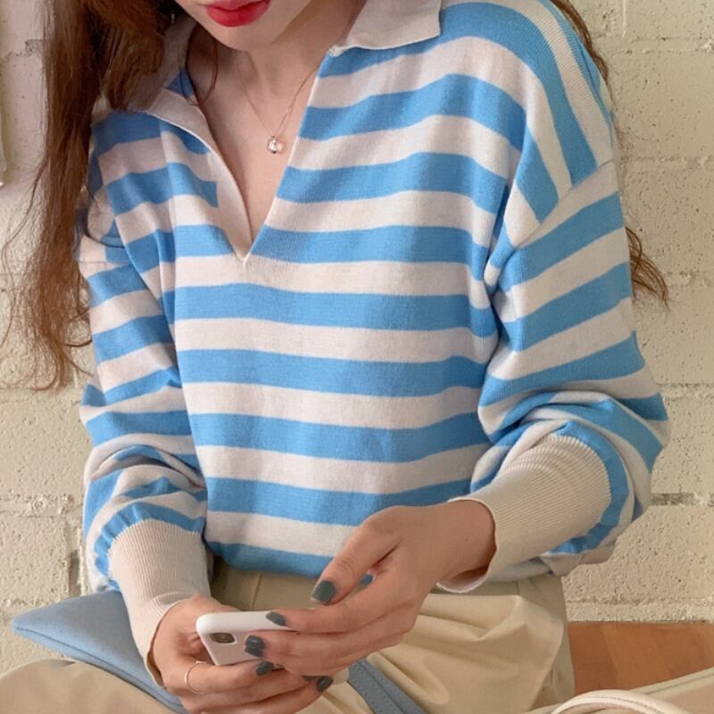 スプリングブラウス スタイルカラールーズ薄手スリーブストライプセーター レディース 春物 シルク 韓国婦人10019553696