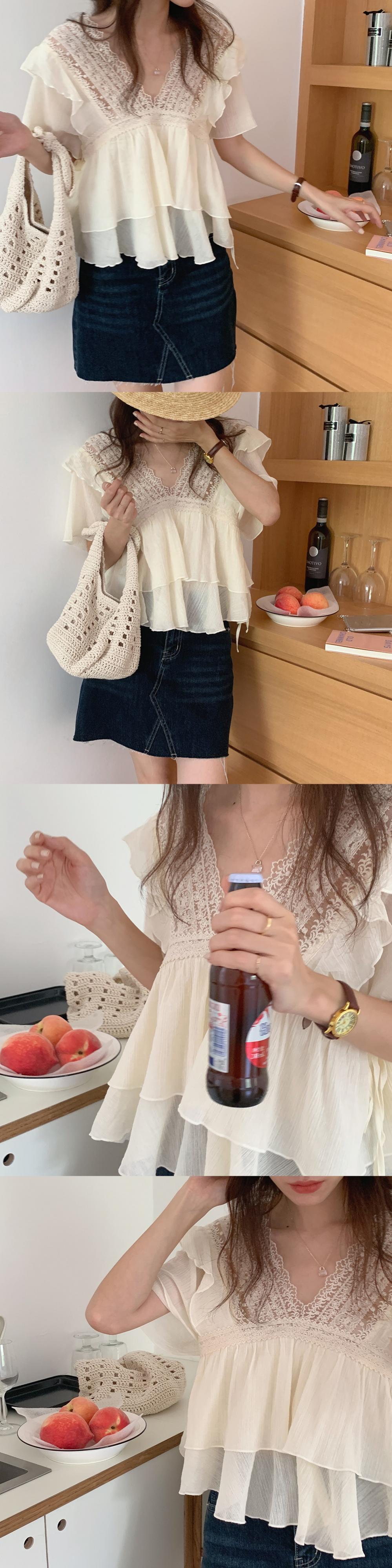 スタイルレースVネックシャツ サマーシフォントップス 夏物 ステッチ 韓国婦人1440938510