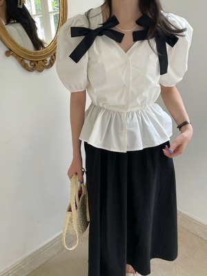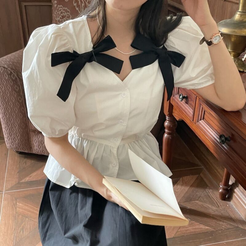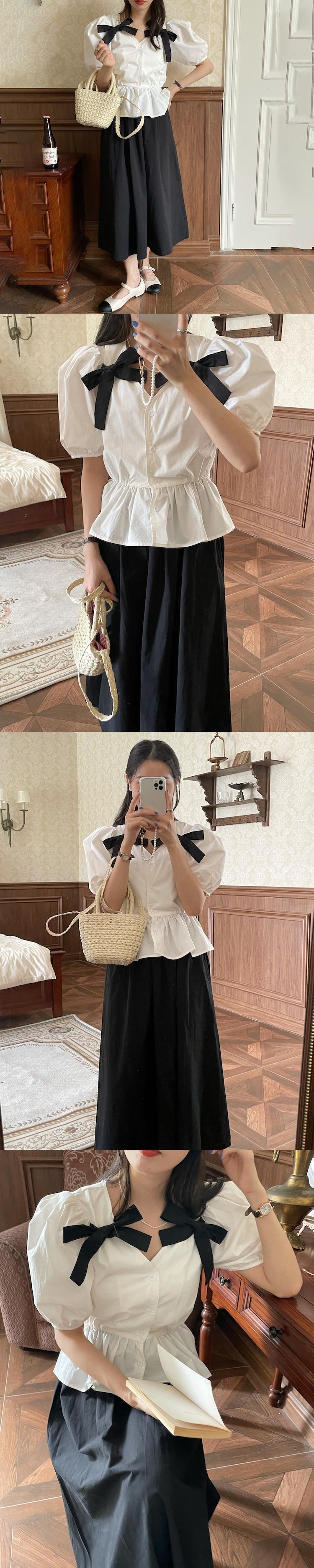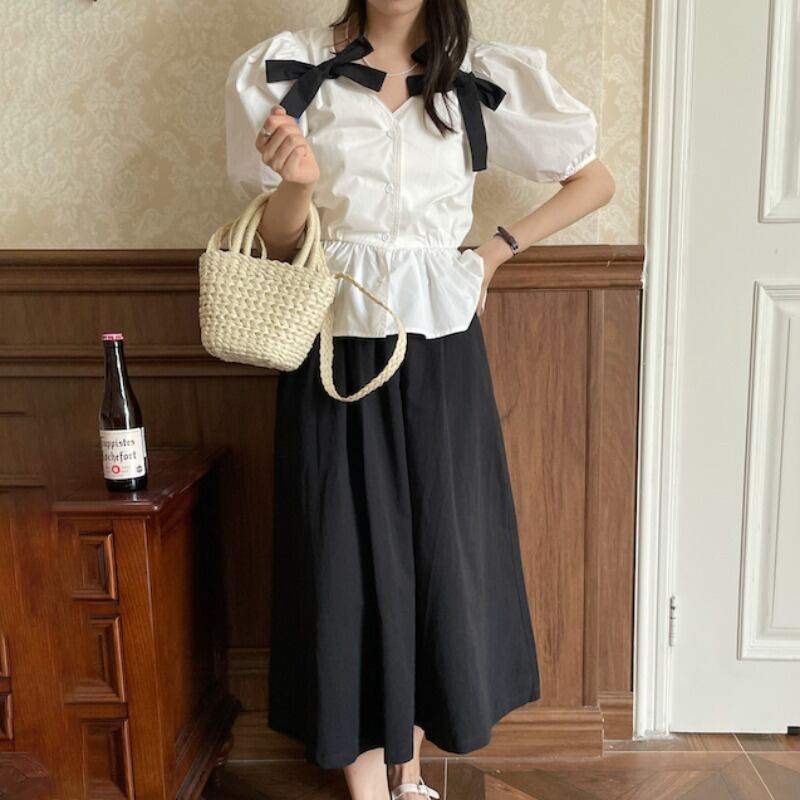スタンダードスリーブホワイトシャツ ベーシックブラックセット リボン レトロ 韓国婦人79459982153