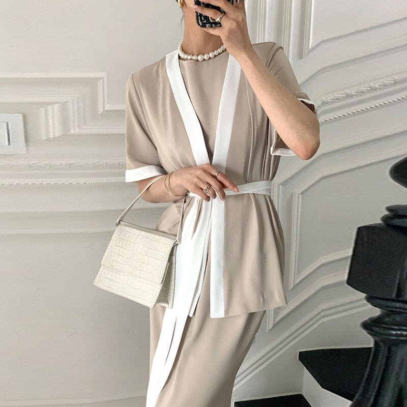 サマースタンダードカラーバンドカーディガンジャケット スリムドレス レトロ 夏物 韓国婦人30234405842