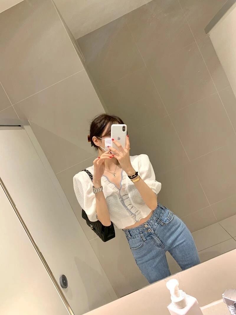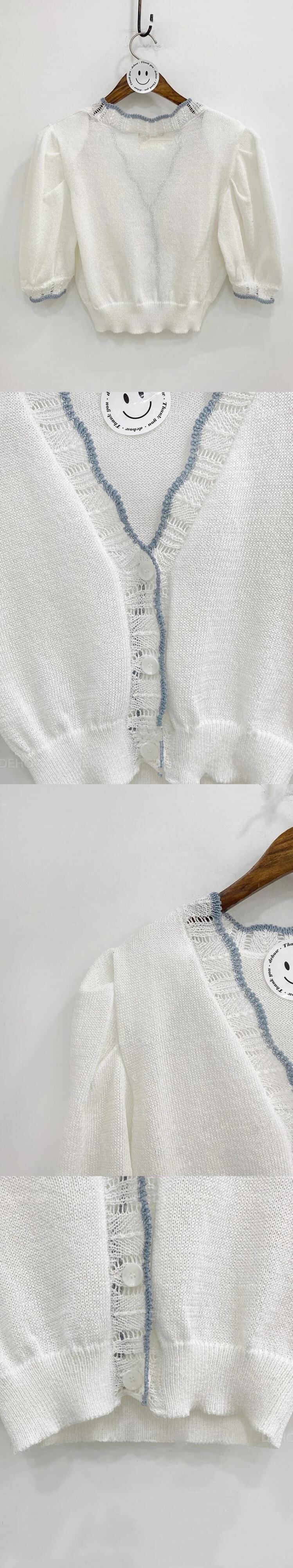 カラーレースVネックスリーブセーター レディースショートトップス サマー 大人ガーリー スウィート キュート カジュアル 夏物 韓国婦人44811535490