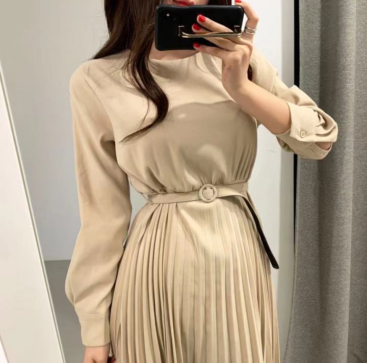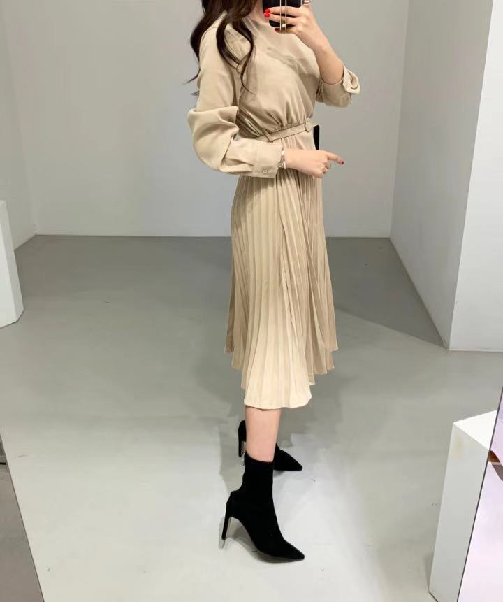 スタンダードベルト ウェスト薄手ハイウェストプリーツドレス レトロ ウィンター 冬物 ハーネス 韓国婦人31182224199