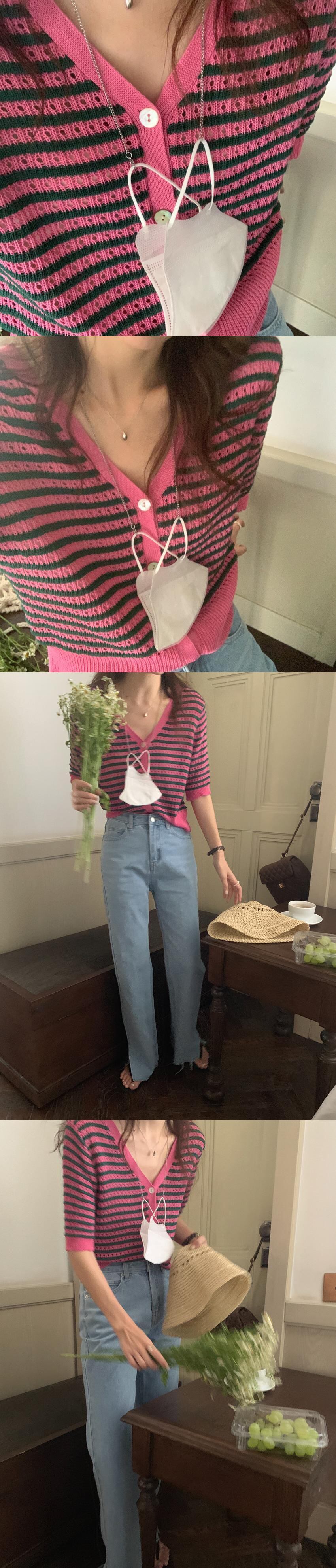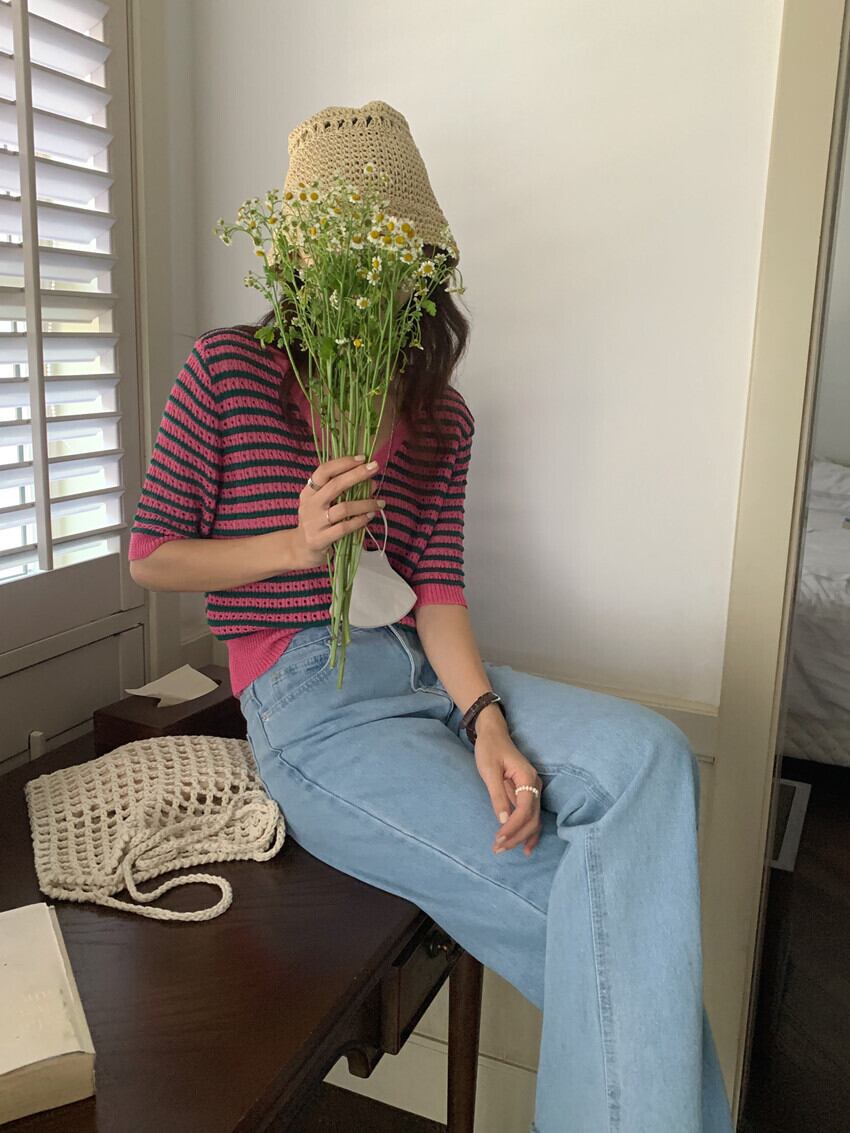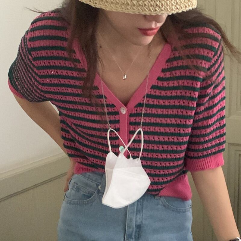 スタンダードカラーストライプVネックセーター レディースサマースタイルクロップドトップス レトロ 夏物 韓国婦人11226837600