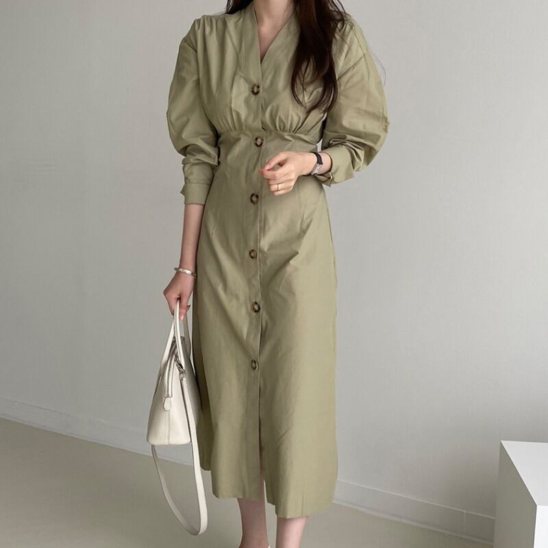 スプリングVネックスリーブウェスト薄手ドレス 春物 韓国婦人67094923030