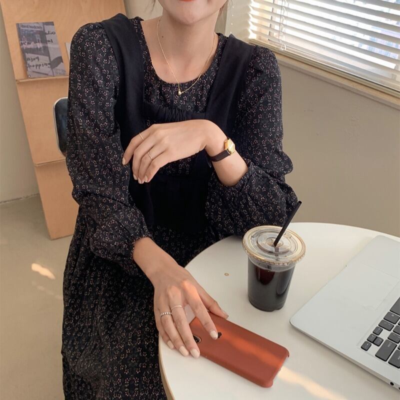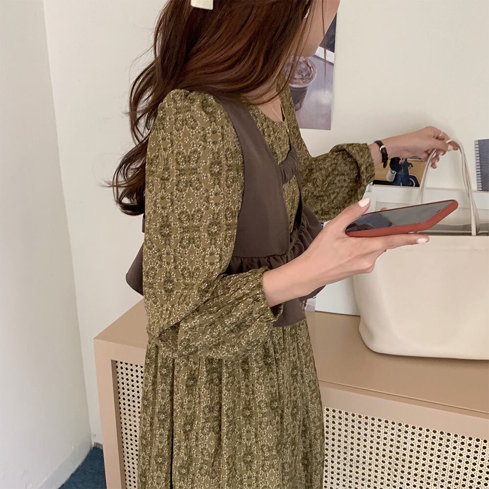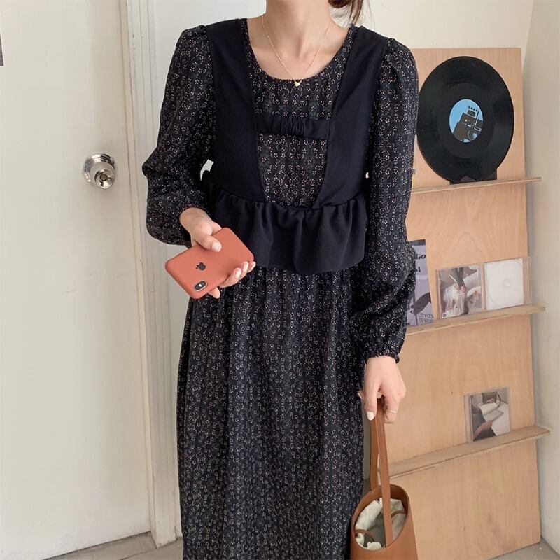 フローラルラウンドネックルーズドレス バックレースウェスト ロング 花柄 Oネック 韓国婦人33387608656